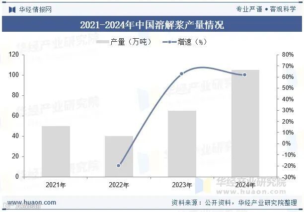 溶解浆是重要的天然高分子材料,广泛用于纤维素醚生产,产品涵盖螯合剂、洗涤剂、墙体腻子粉、食品添加剂等。2024年全球纤维素醚用溶解浆消费量约70万吨,占全球总消耗量的8.86%,同比增长16.67%。同年我国溶解浆产量达105万吨,同比增长61.5%。