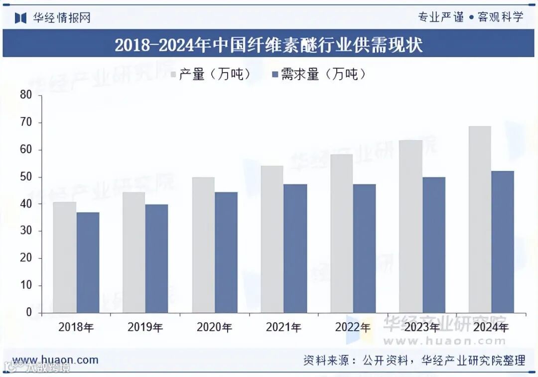纤维素醚需求与经济发展水平密切相关。随着我国经济持续增长及人民生活水平提升,相关产业对纤维素醚的需求稳步上升。2024年,我国纤维素醚产量为68.88万吨,需求量为52.45万吨。
