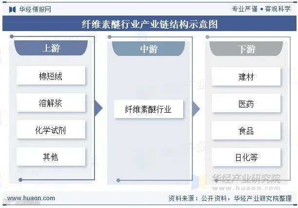 上游主要包括棉短绒、溶解浆及化学试剂(如氢氧化钠、氯甲烷、环氧乙烷等)。中游为纤维素醚的生产制造环节。下游广泛应用于建材、医药、食品、日化、造纸、纺织等多个领域。