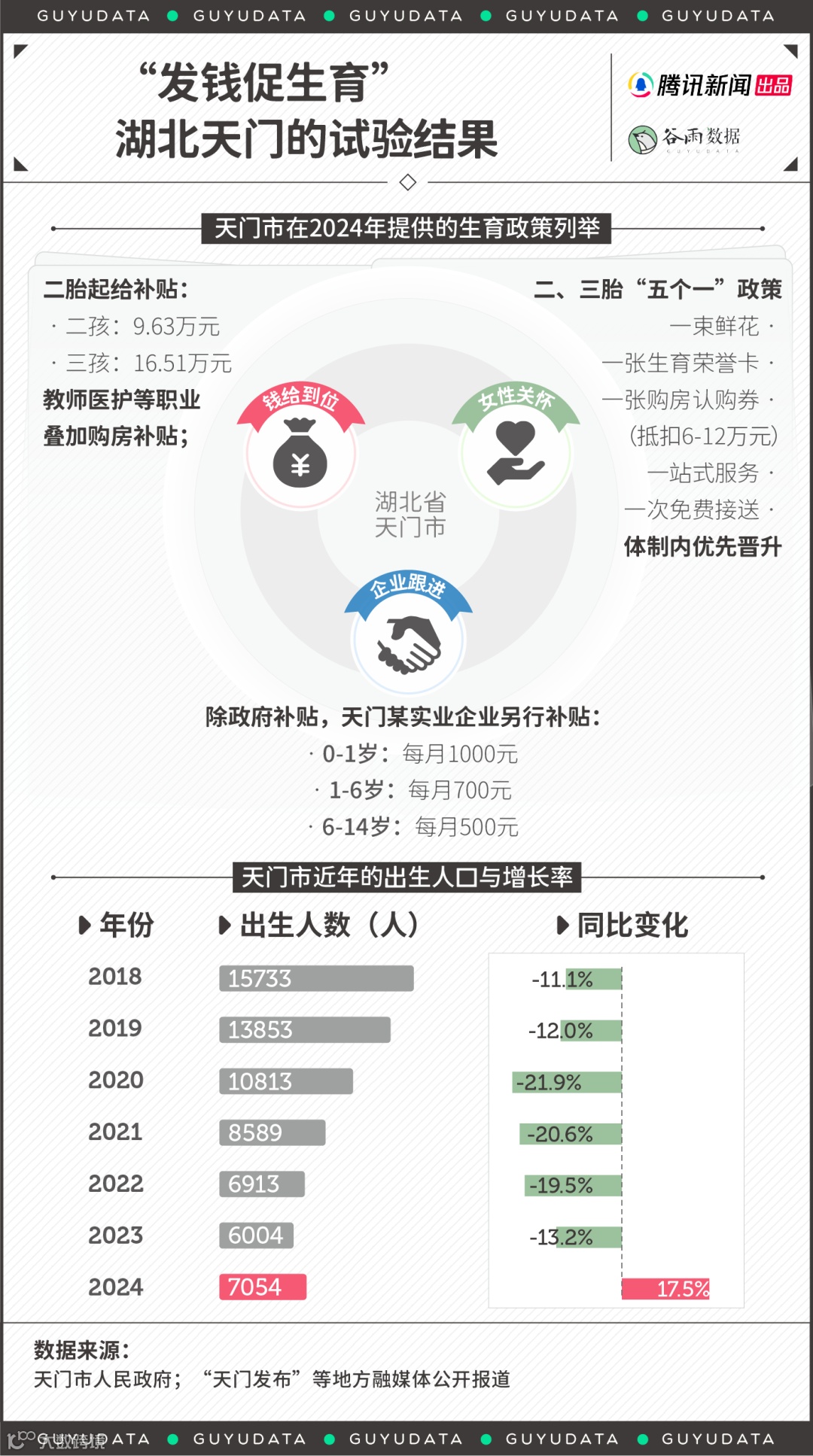 根据地方融媒体“天门发布”,天门市2024年出生人口同比增加1050人,增幅17%。八年来,出生人口首次实现“由降转增”。