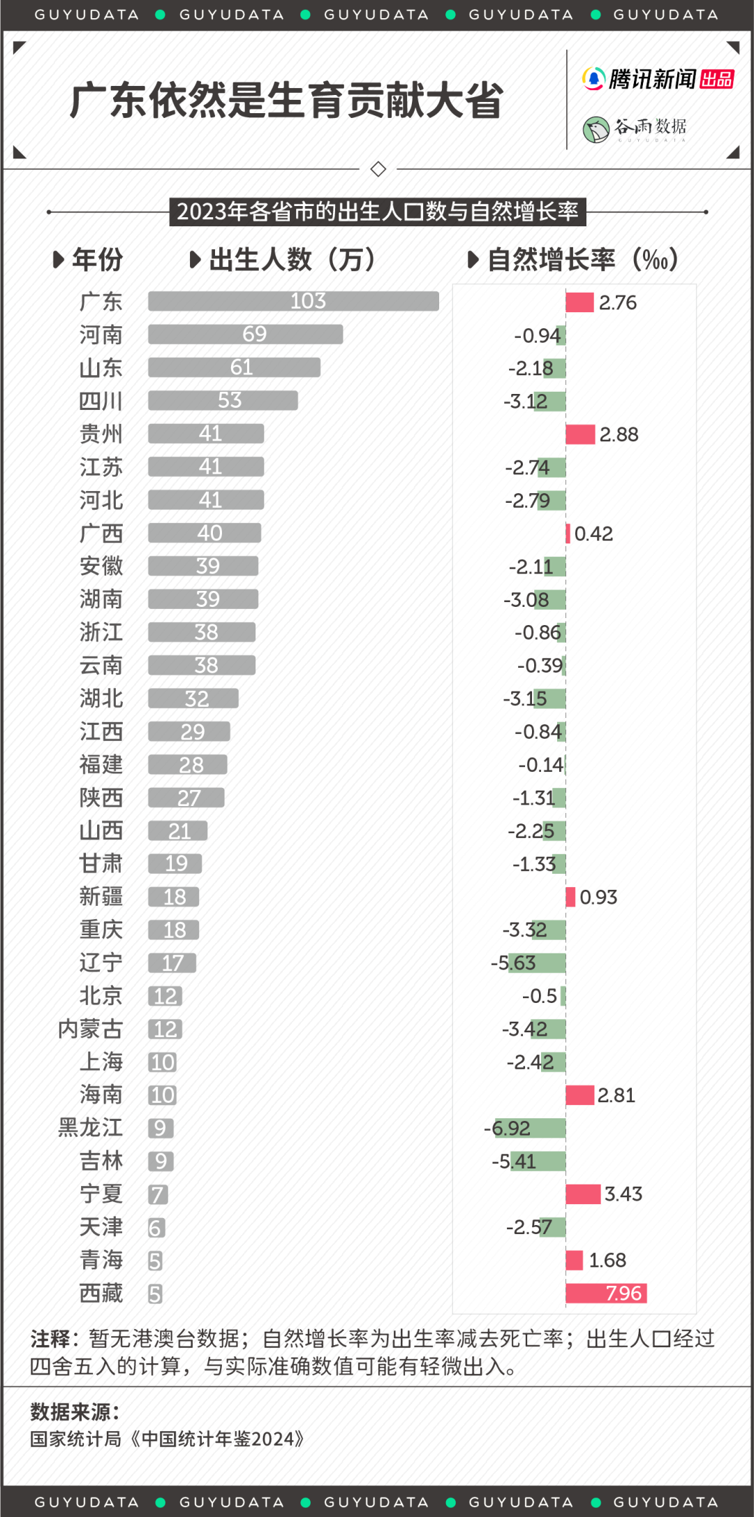 即,当年合计902万新生人口中,广东诞生的新生儿占了九分之一。由于普遍的老龄化,绝大多数省市的自然增长率都为负数,广东作为仅有的经济大省保持了人口正增长。