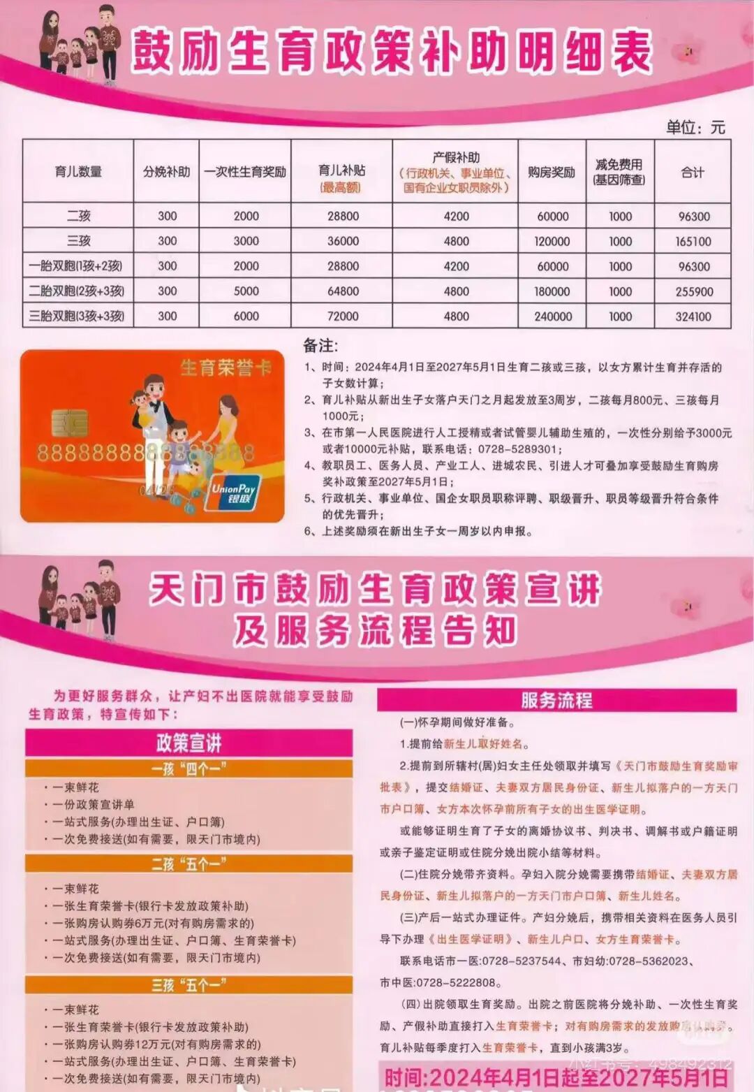上图为天门市的鼓励生育补助明细表,但主要针对多次生育家庭。首次生育除非双胞胎,否则暂无补助。