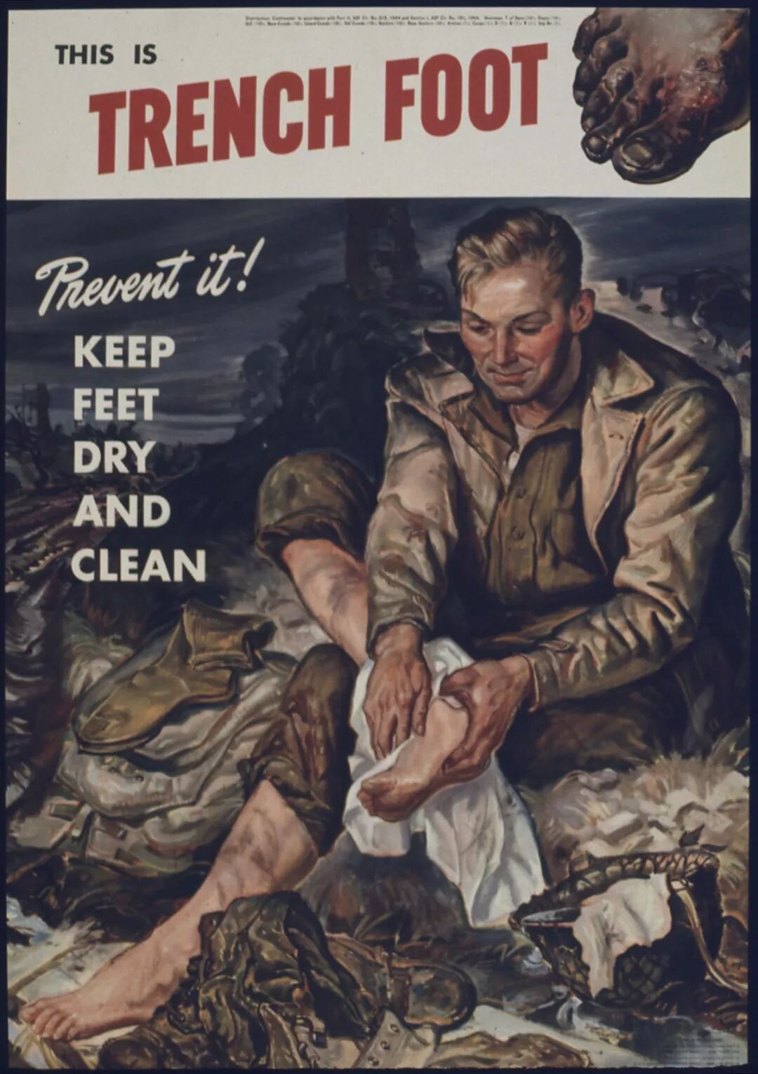 众多“非战斗减员”的原因之中,有一种病非常可怕,那就是战壕足。战壕足的学名是“浸渍足”。是因为双脚长时间(数小时,甚至数天)静止处于于寒冷、潮湿的环境中。患病后脚部会变得冰冷、肿胀,并且外表呈现蜡状。轻则影响战斗力造成减员,严重的甚至需要截肢!