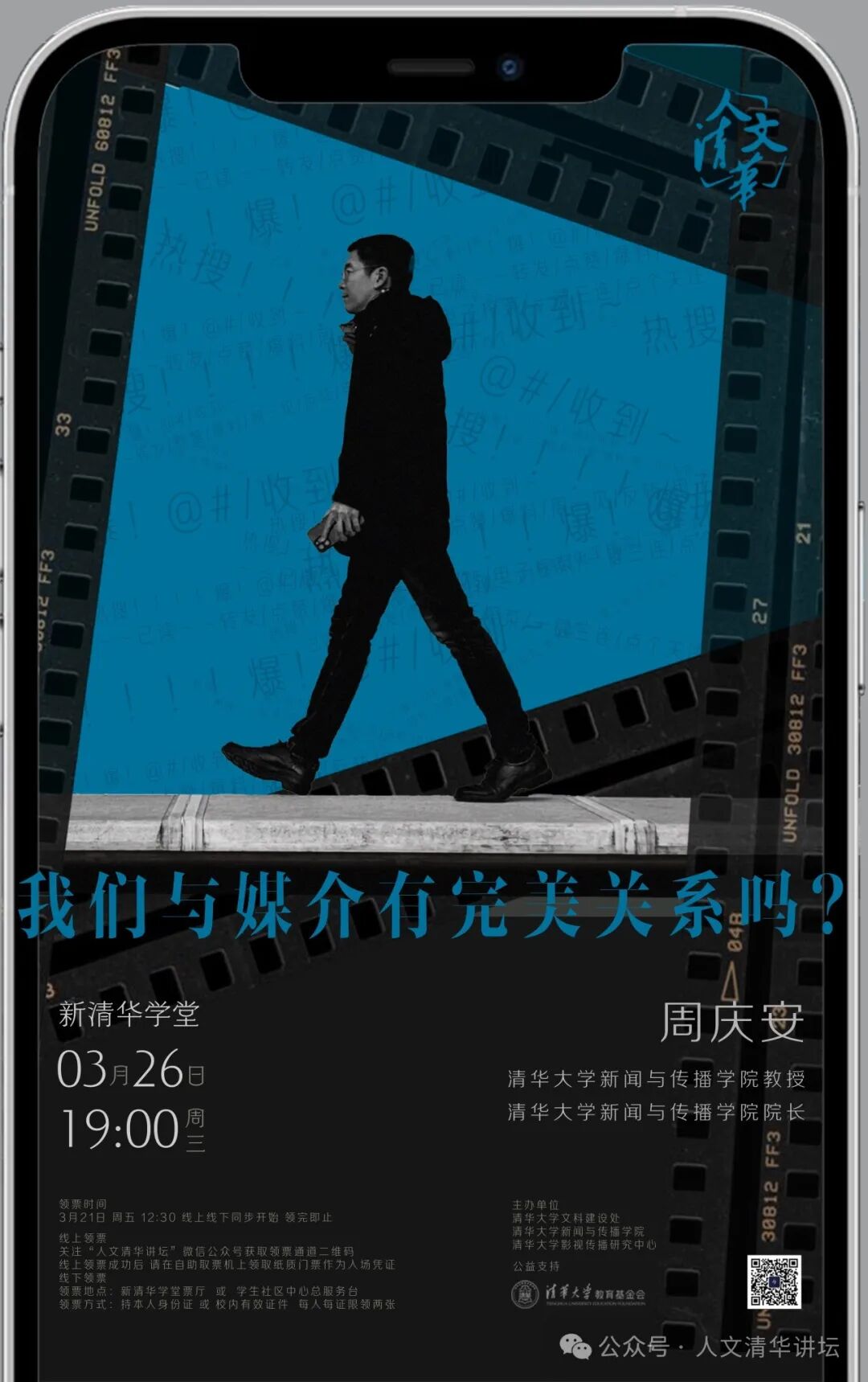 3月26日晚7点,人文清华讲坛,清华大学新闻与传播学院院长周庆安教授演讲,“我们与媒介有完美关系吗?”深入探讨人与媒介如何共生,走向更好的未来。