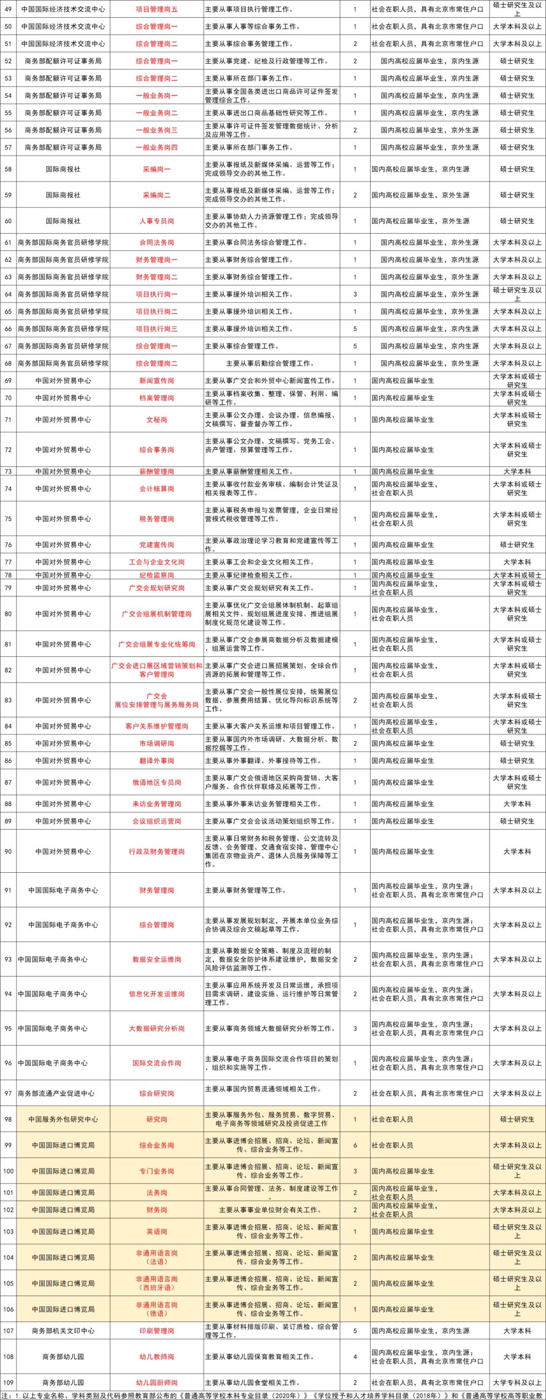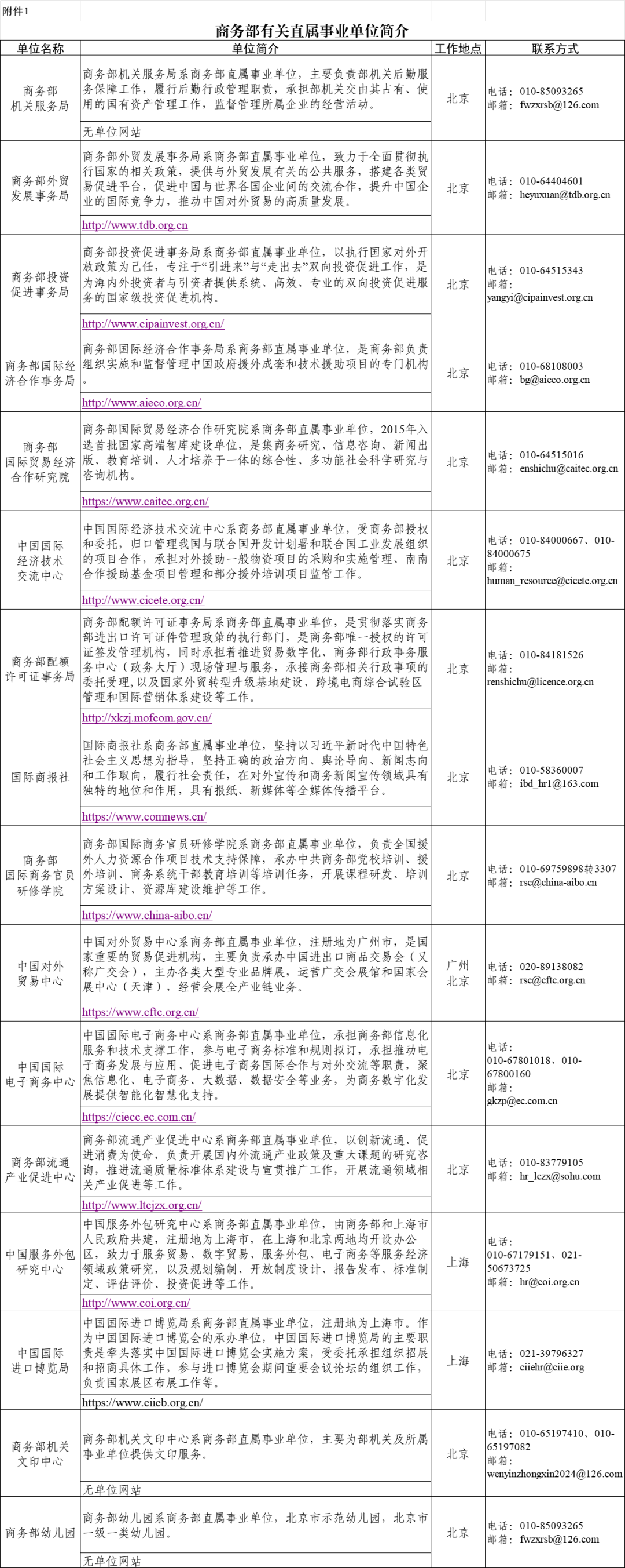 此次招聘涉及商务部机关服务局、商务部外贸发展事务局、商务部投资促进事务局、商务部国际经济合作事务局、商务部国际贸易经济合作研究院、中国国际经济技术交流中心、商务部配额许可证事务局、国际商报社、商务部国际商务官员研修学院、中国对外贸易中心、中国国际电子商务中心、商务部流通产业促进中心、中国服务外包研究中心、中国国际进口博览局、商务部机关文印中心、商务部幼儿园16家商务部直属事业单位,共计招聘工作人员169人,招聘单位简介详见《商务部有关直属事业单位简介》,具体岗位及相关要求详见