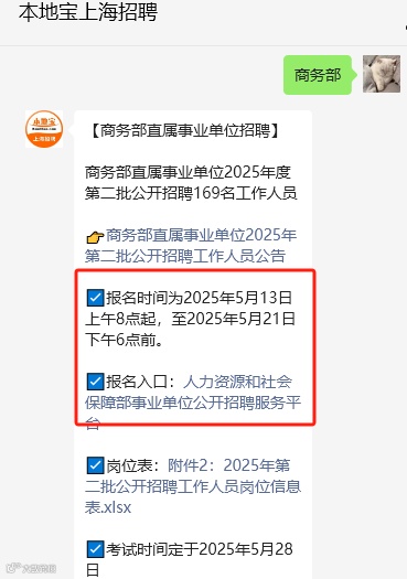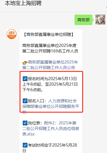 温馨提示:进入【本地宝上海招聘】公众号,对话框回复关键词【商务部】,即可快速获取报名表、完整公告、报名入口、完整岗位表信息。