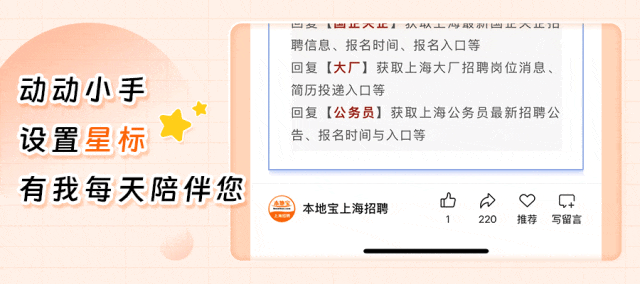 温馨提示:进入【本地宝上海招聘】公众号,对话框回复关键词【社区】,即可快速获取报名入口、完整招聘公告等信息。