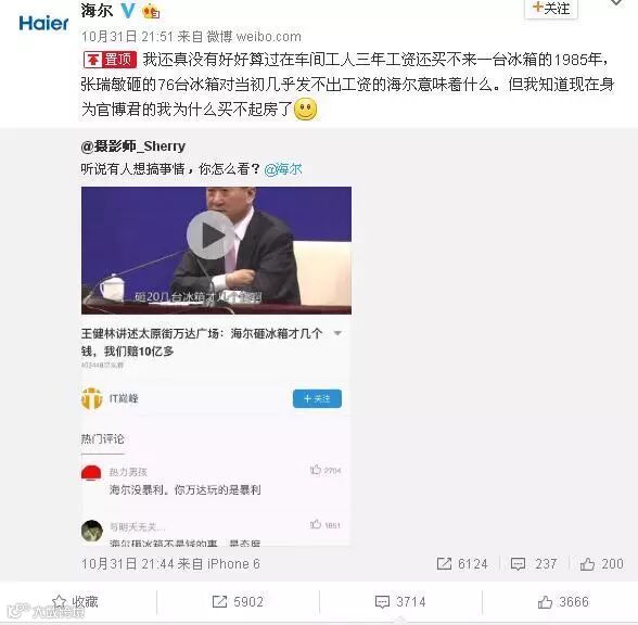 这样的盛况已经不是第一次,还记得海尔前段时间,在首富粑粑王健林与海尔碰瓷事件,海尔就很好的发挥热点带头作用,当然那次海尔也是事件主角之一。当时王健林在讲述太原街万达广场时,借用了民族品牌海尔为例子。原话:海尔砸冰箱才几个钱啊,我们赔10亿多......