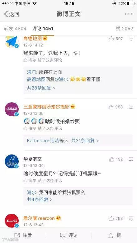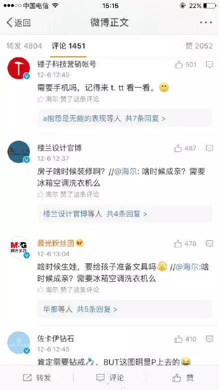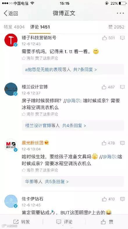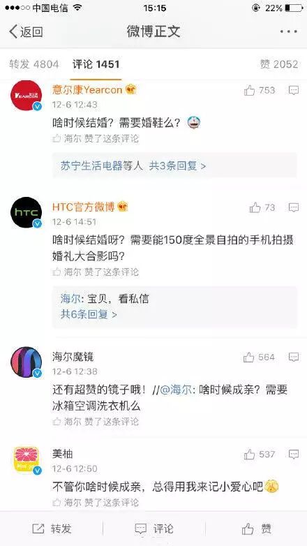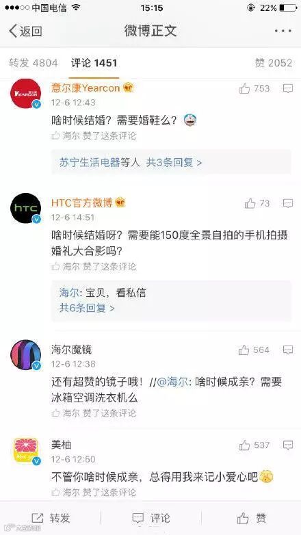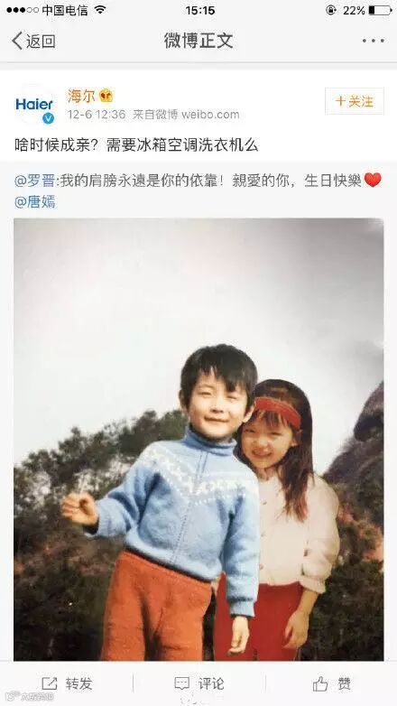 海尔官微:啥时候成亲?需要冰箱空调洗衣机吗?在明星罗晋与唐嫣刚刚公开的恋情微博下赫然出现,本该是明星粉丝出没的地方,海尔的出现确实够醒目!!!