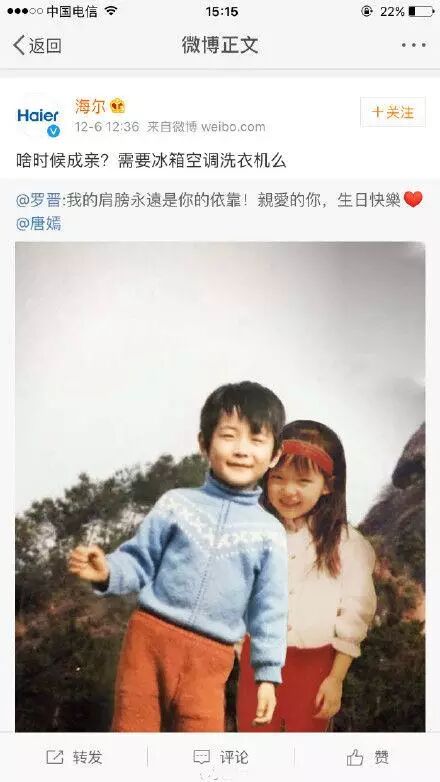 #唐嫣罗晋公开恋情#糖糖公开咯!!!以海尔带头的各大官微“”当然不能放弃这么好的营销热点。开启了推销自家产品的模式~~~