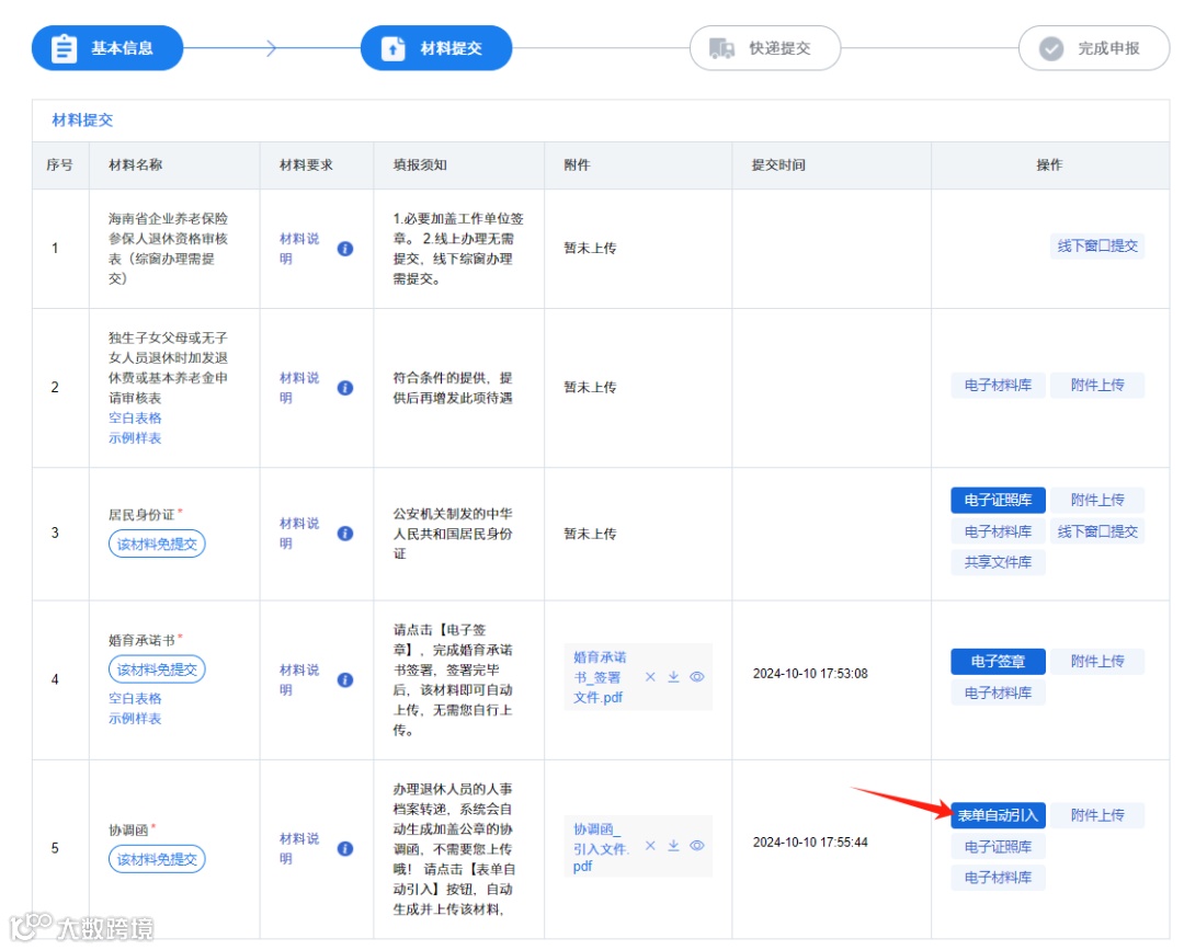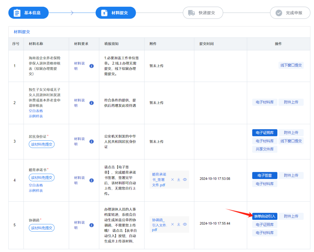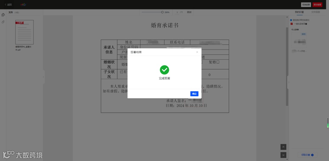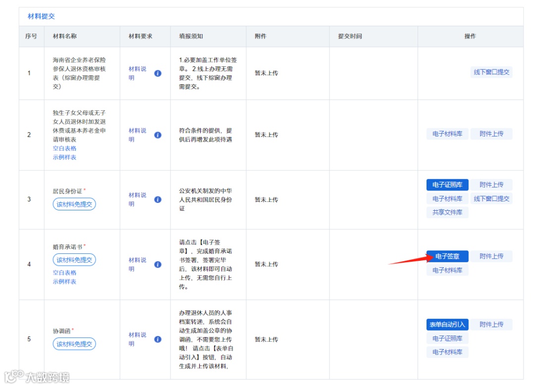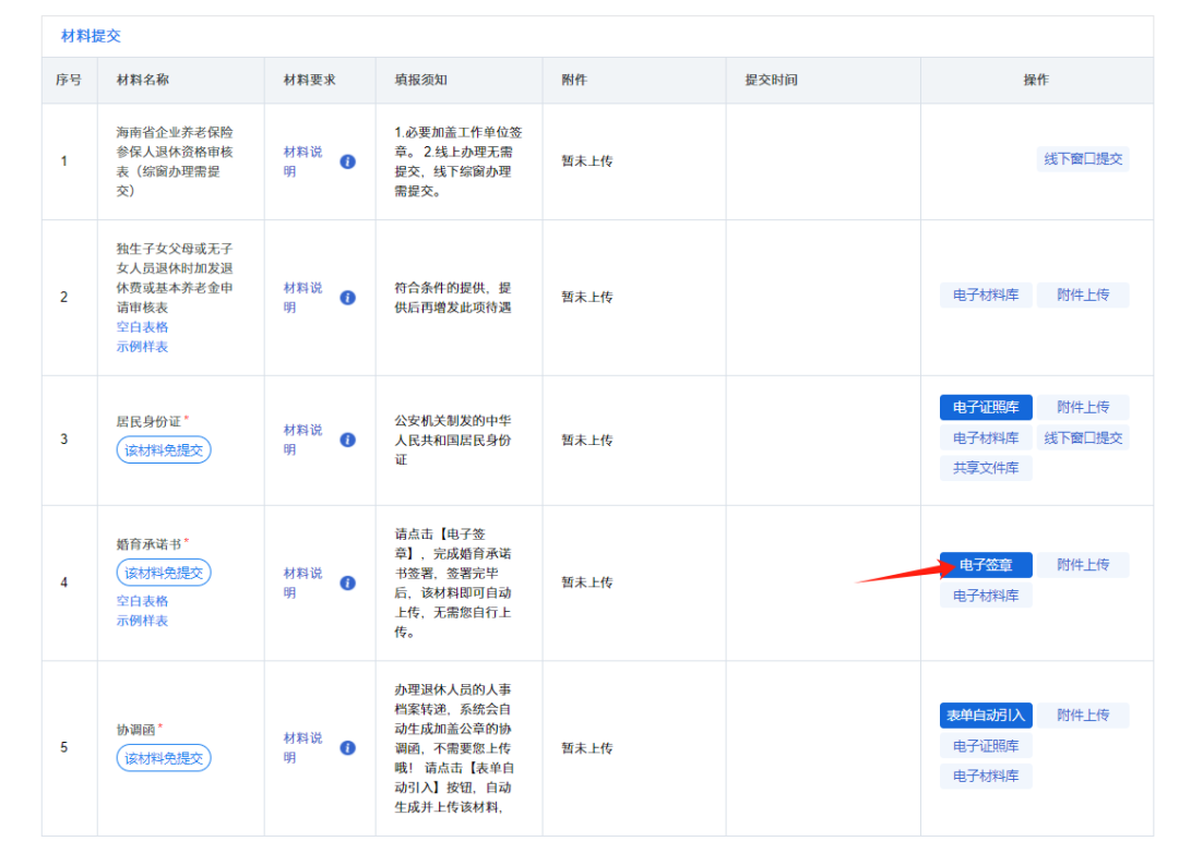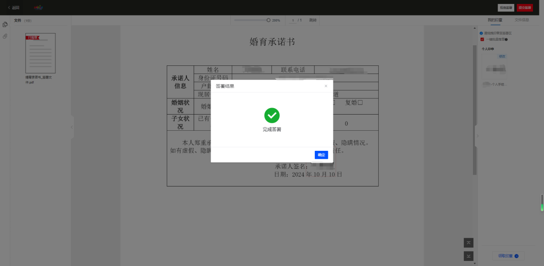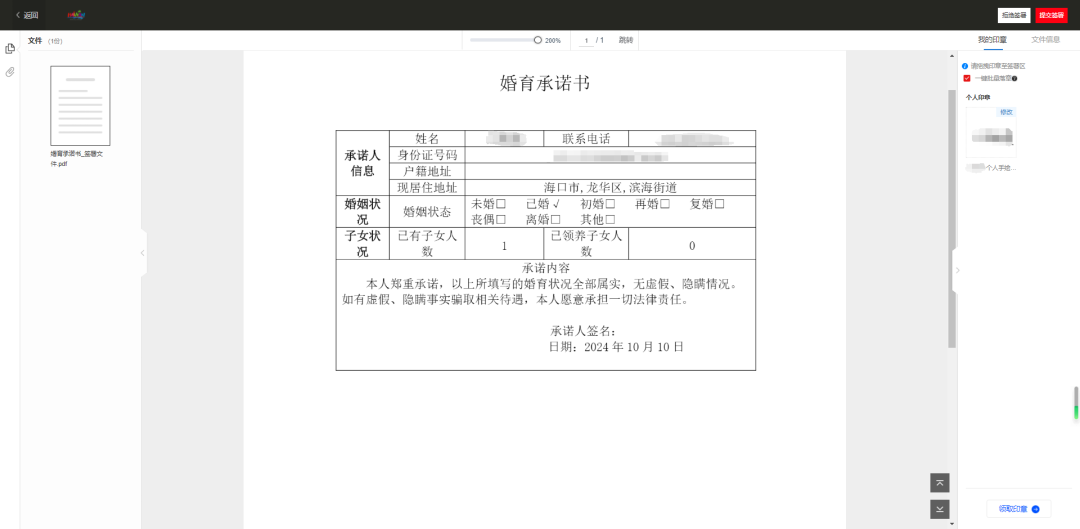 操作完毕后,回到办件页面中,系统会自动上传已签署的【婚育承诺书】文件。