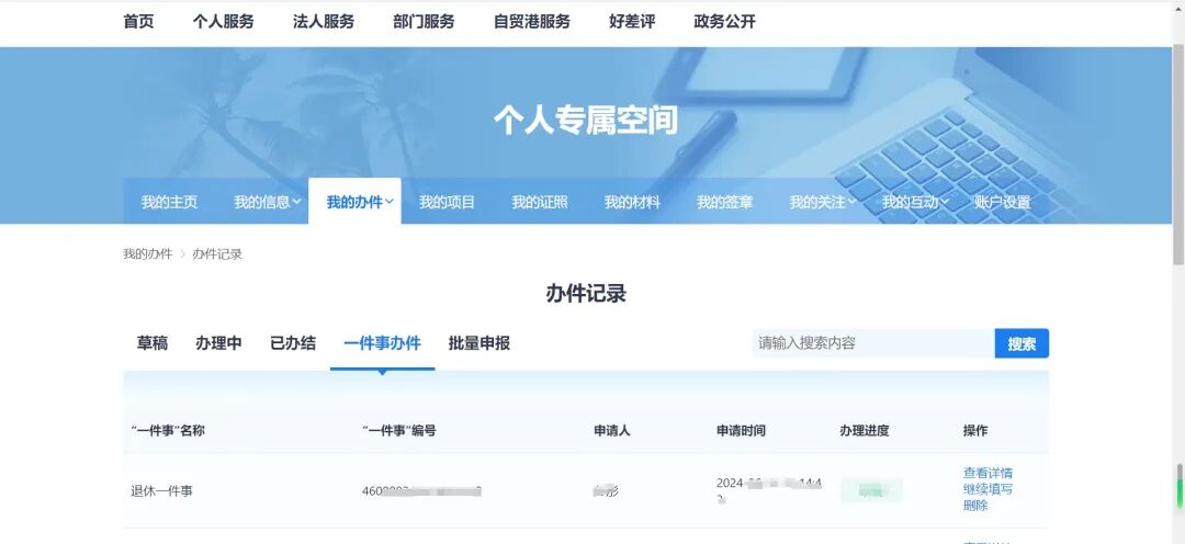 点击【个人/企业专属空间→企业办件→一件事办件】,在一件事办件列表中找到办件,点击【查看详情】可进入该办件的办件详情页面,查看办理进度。