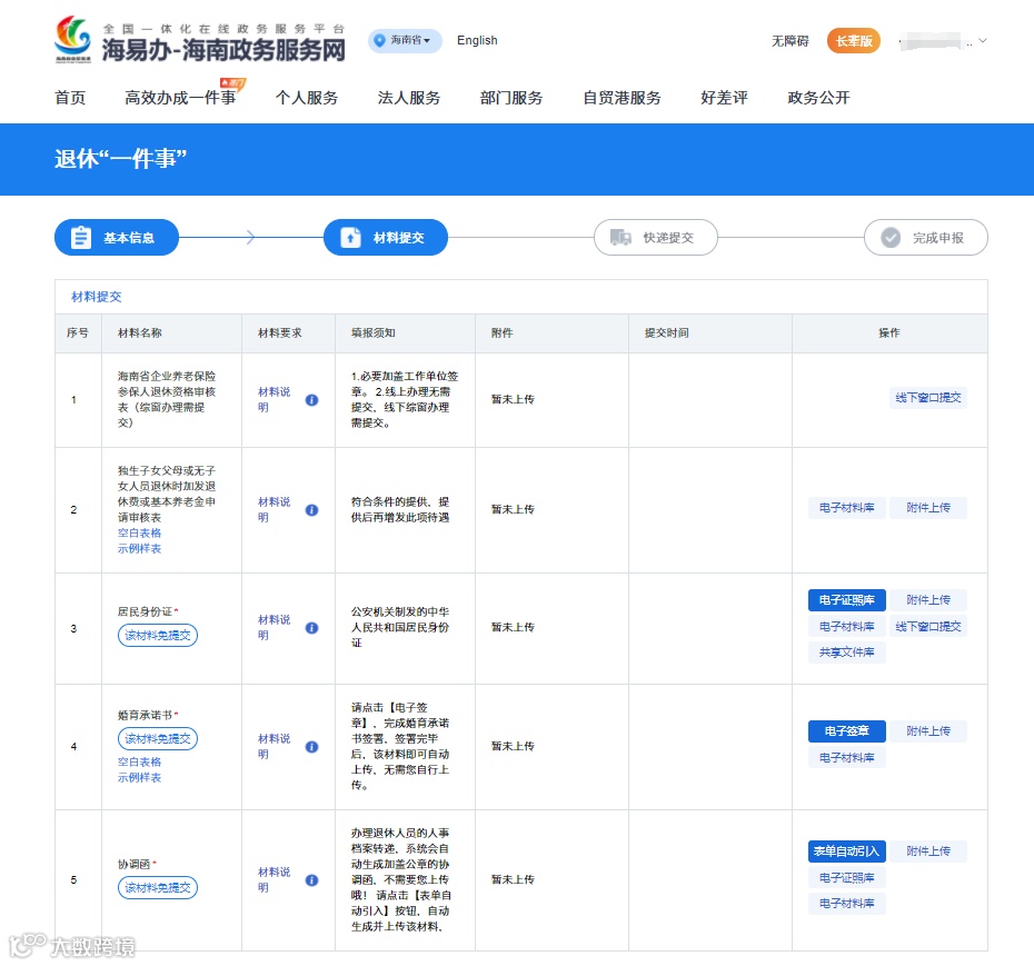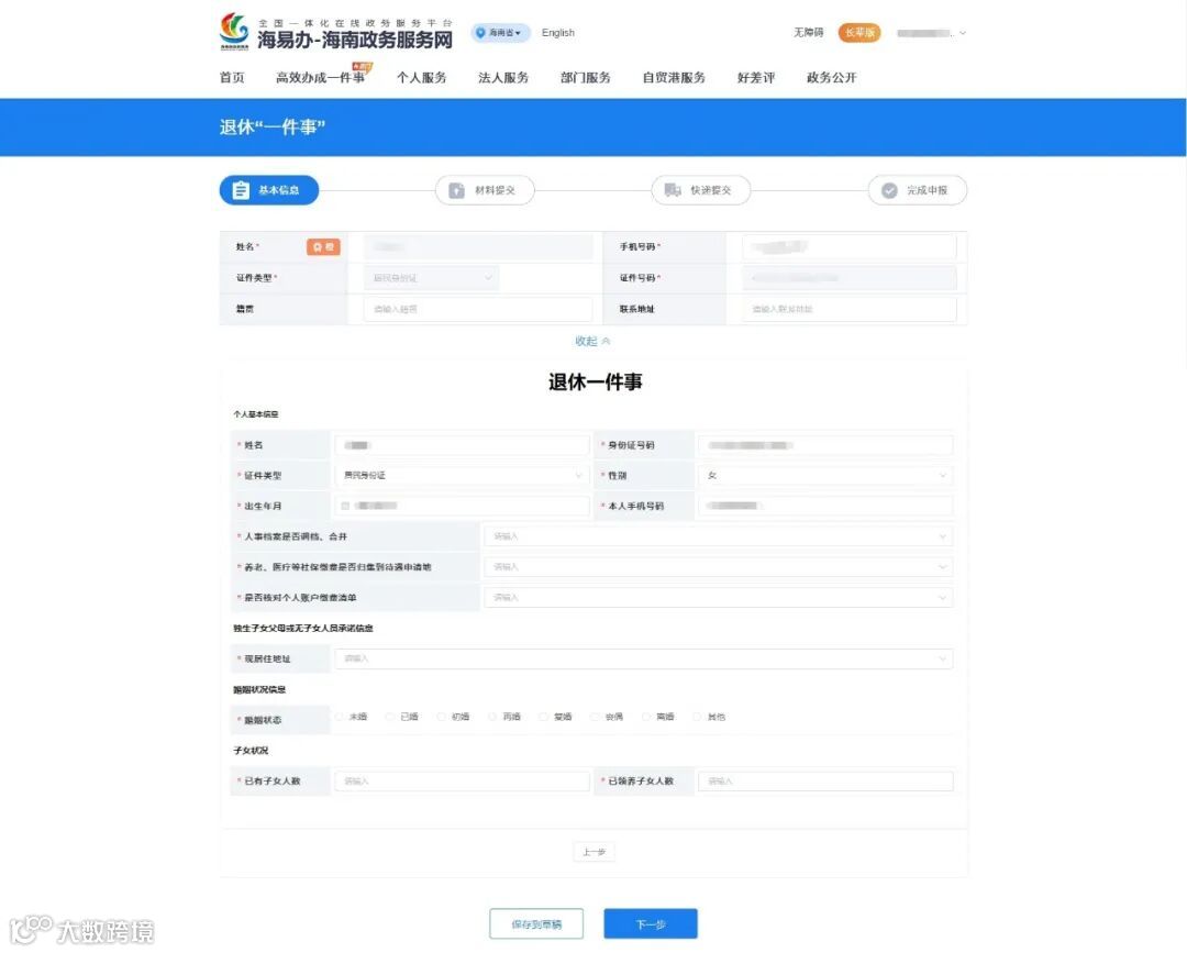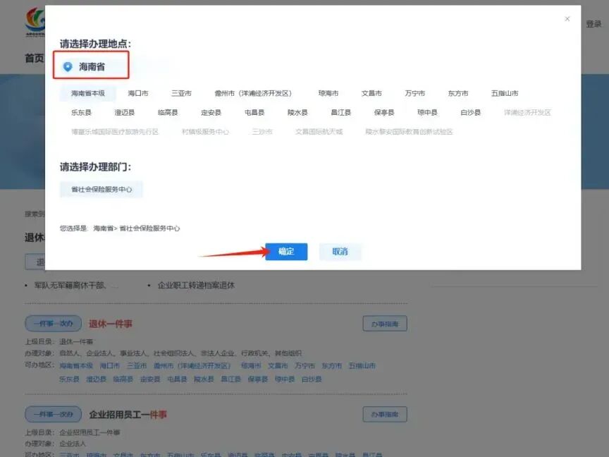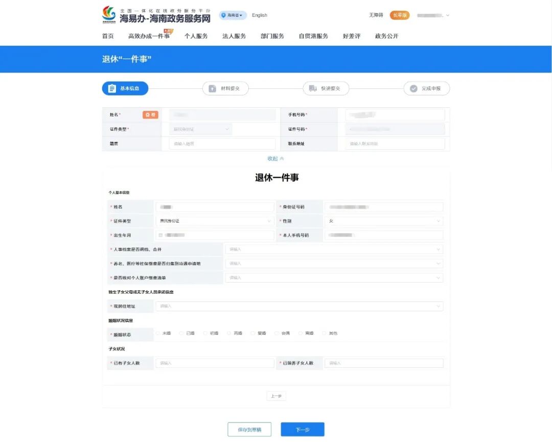 ✎1.建议最好用退休人员本人的海南政务服务网/海易办账号进行登录办理,以便可以读取到更多共享信息、资料。