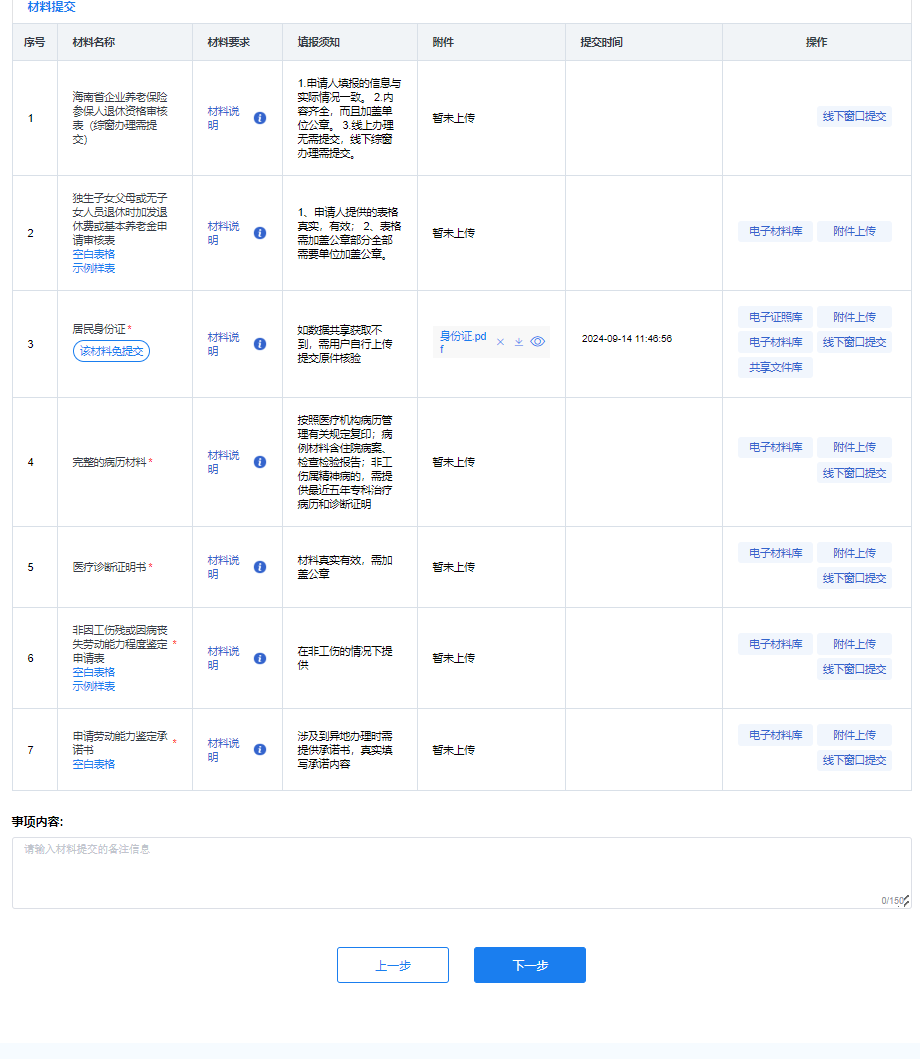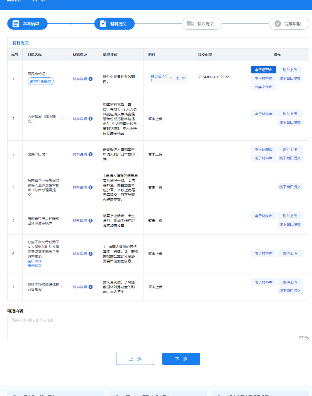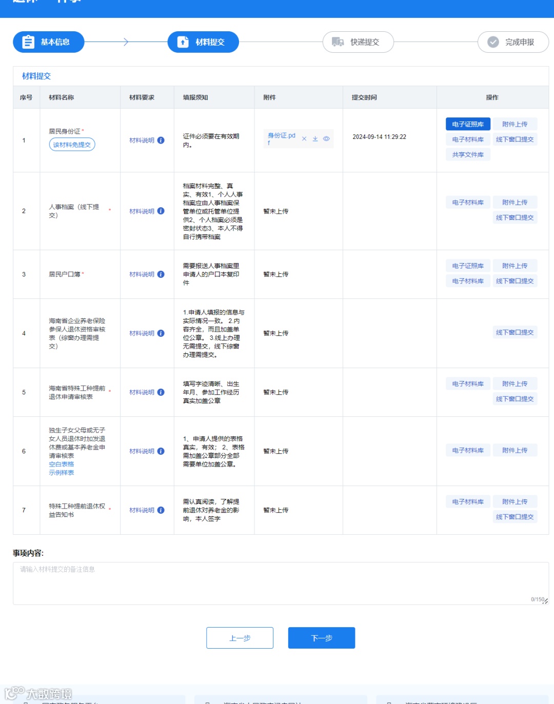 3.办理特殊工种人员提前退休审批时,需要提交“特殊工种提前退休权益告知书”和“海南省特殊工种提前退休申请审核表”等材料。可以通过点击【共享文件库】按钮,选择获取到的审批结果进行上传;若无法获取到共享文件,则用户需通过附件上传。