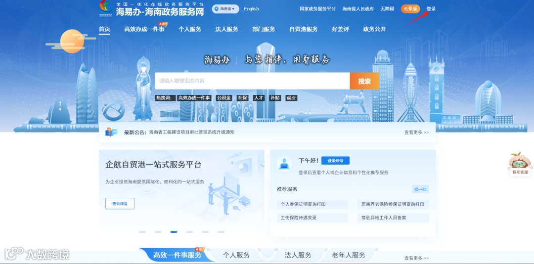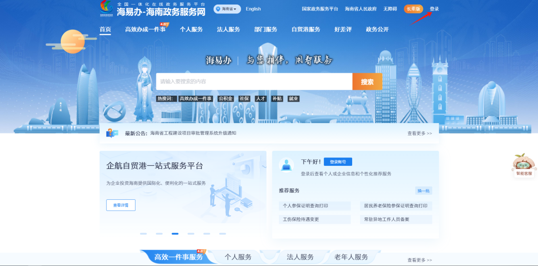 打开【海南政务服务网】点击右上角登录,通过“海易办”app、微信小程序、支付宝小程序、电子社保卡扫码登录或使用密码、验证码登录。