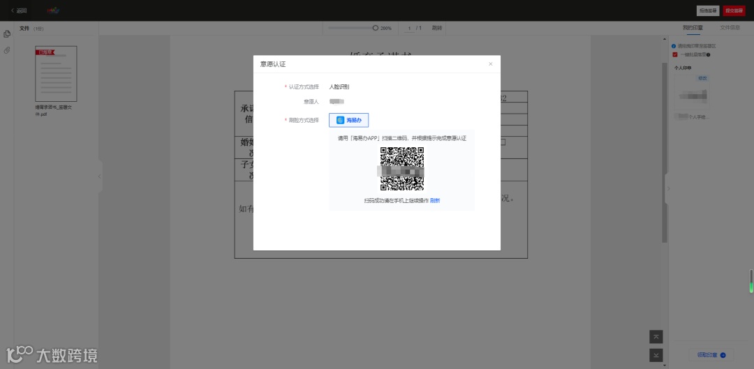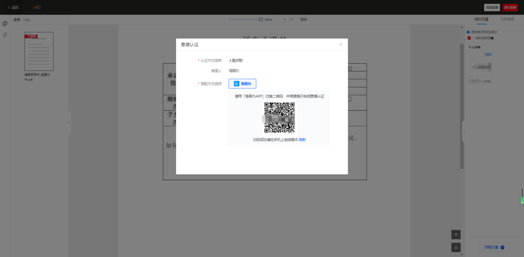 在该页面中,鼠标点击拖动右侧的个人签章,将个人签章拖入承诺人签名处,选择【提交签署】。