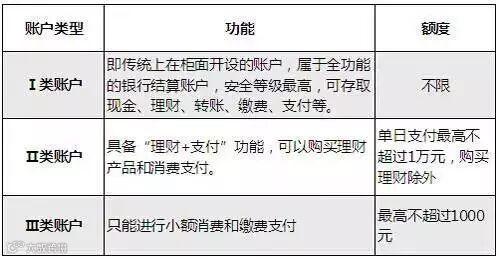 2016年4月1日,央行将个人银行账户分为Ⅰ类户、Ⅱ类户和Ⅲ类户,不同种类的账户功能有所不同: