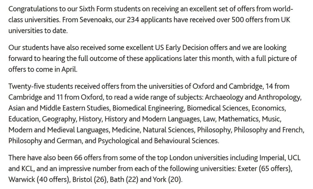 作为IB领头羊,七橡树中学以其卓越的学术成绩和全面的教育质量闻名遐迩,截至2025年2月,七橡树中学234名六年级申请者共获得500+份英国大学录取。具体如下: