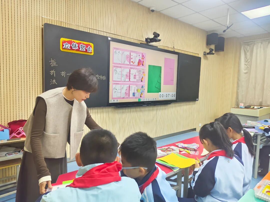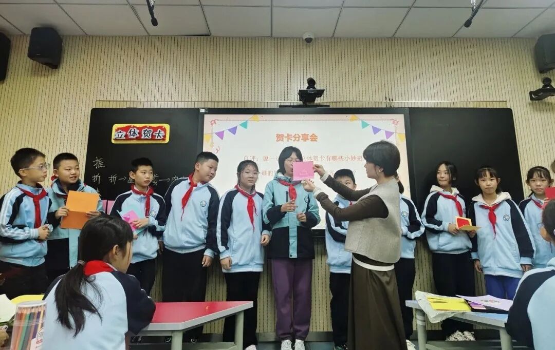 高蓓老师的《立体贺卡》一课,聚焦“立体推折结构”核心技能,结合五年级学生空间感知能力特点,通过“平面与立体贺卡对比导入”激发兴趣,以“分步拆解+实物演示”清晰讲解剪折步骤,引导学生在20分钟内高效掌握推折方法,并用简单装饰传递情感,既实现了技能落地,又让学生体会到手工贺卡的仪式感与文化意义。
