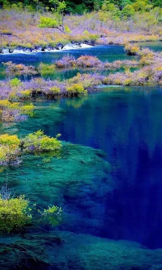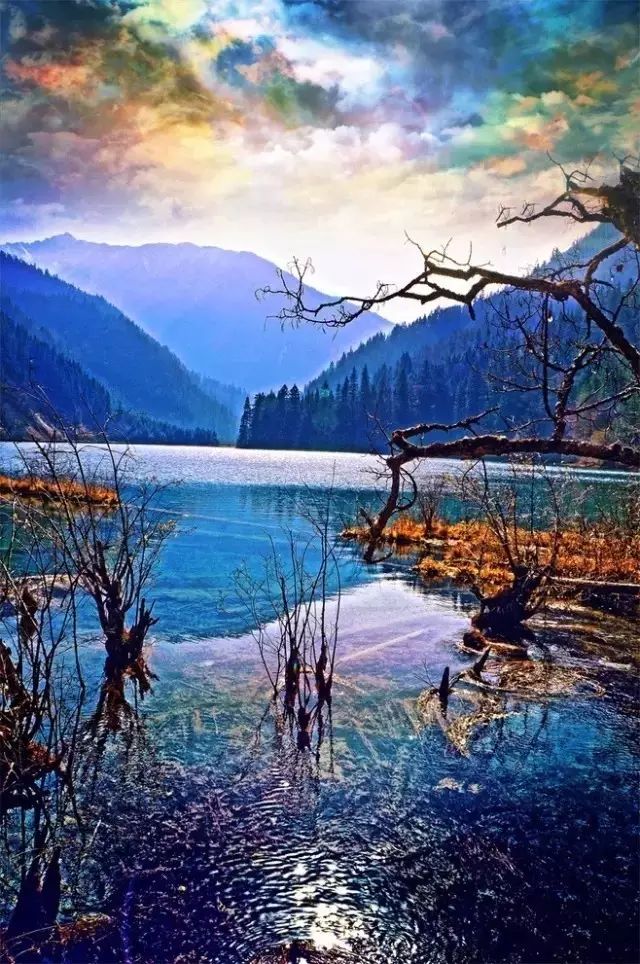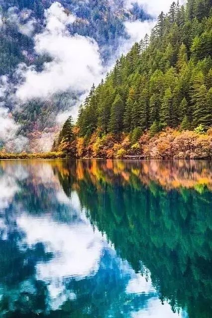 山峦与树林交相辉映,缤纷的落叶在湖光流韵间漂浮,悠远的晴空湛蓝而碧净,九寨沟在自然的手中变成一幅缤纷的油彩世界,让你忘却世间无畏的纷争和烦恼。