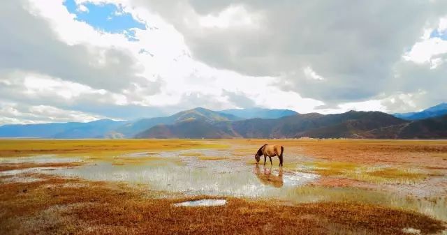 每当秋风渐起,香格里拉的纳帕海草原一片金黄,远山如黛,皑皑雪峰倒映于湖泊之中,美不胜收。
