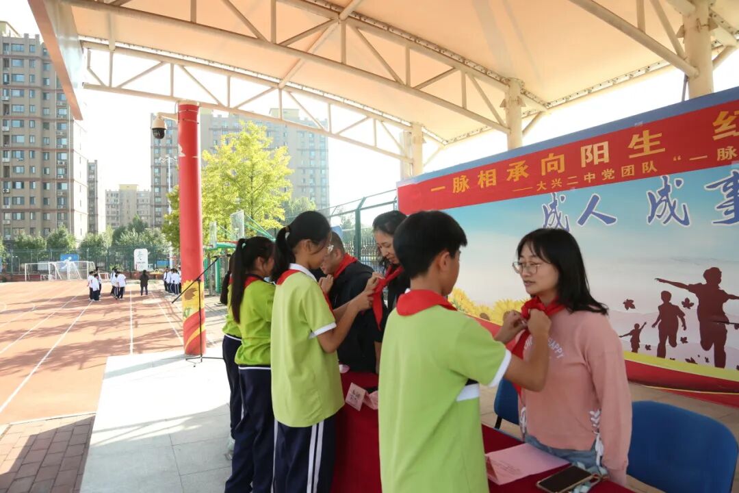 金风送爽,丹桂飘香。值此中国少年先锋队成立76周年之际,大兴二中二年级、六年级师生于10月13日下午齐聚操场,以庄重而热烈的仪式迎接二年级新队员的加入。大兴二中党委李娜书记、首座校区负责人袁桂秋主任、小学部曹莹主任、教学迟淑慧主任等校领导亲临现场,六年级优秀少先队代表为各位领导佩戴红领巾。