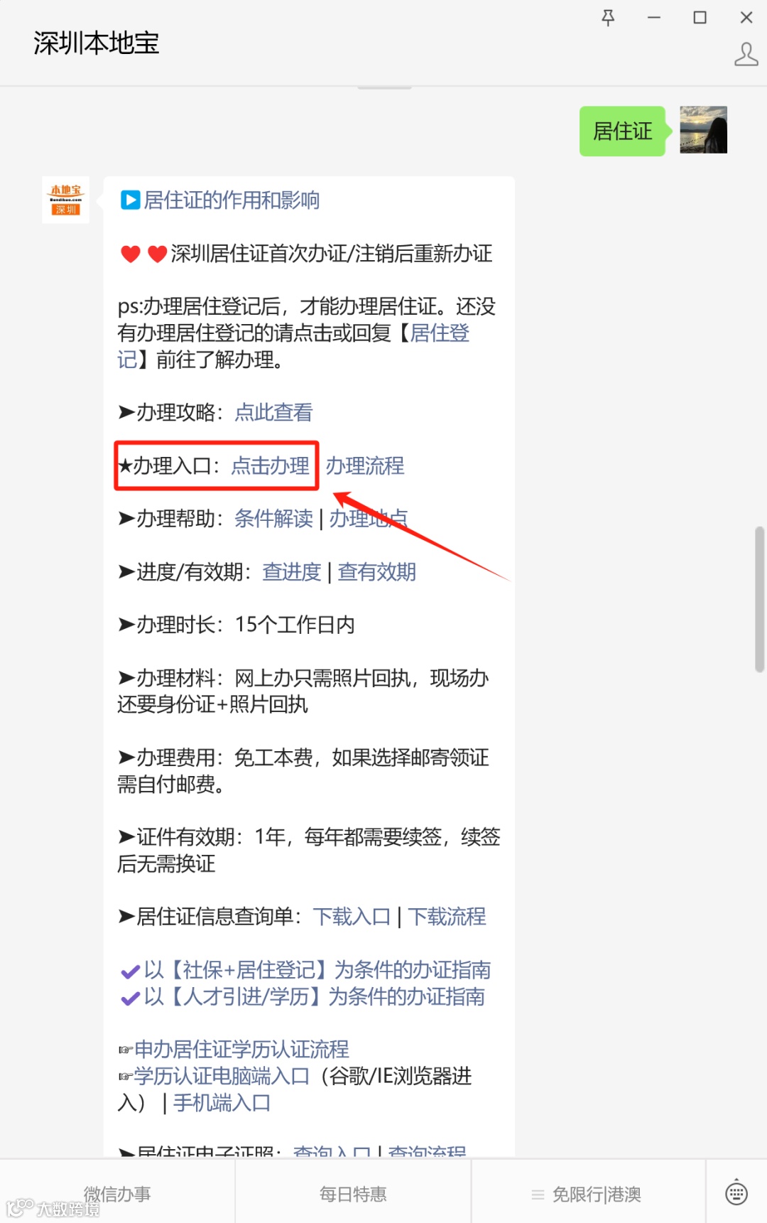 也可以扫描下方二维码,跳转【深圳本地宝】公众号,回复【居住证】→选择【办理入口】