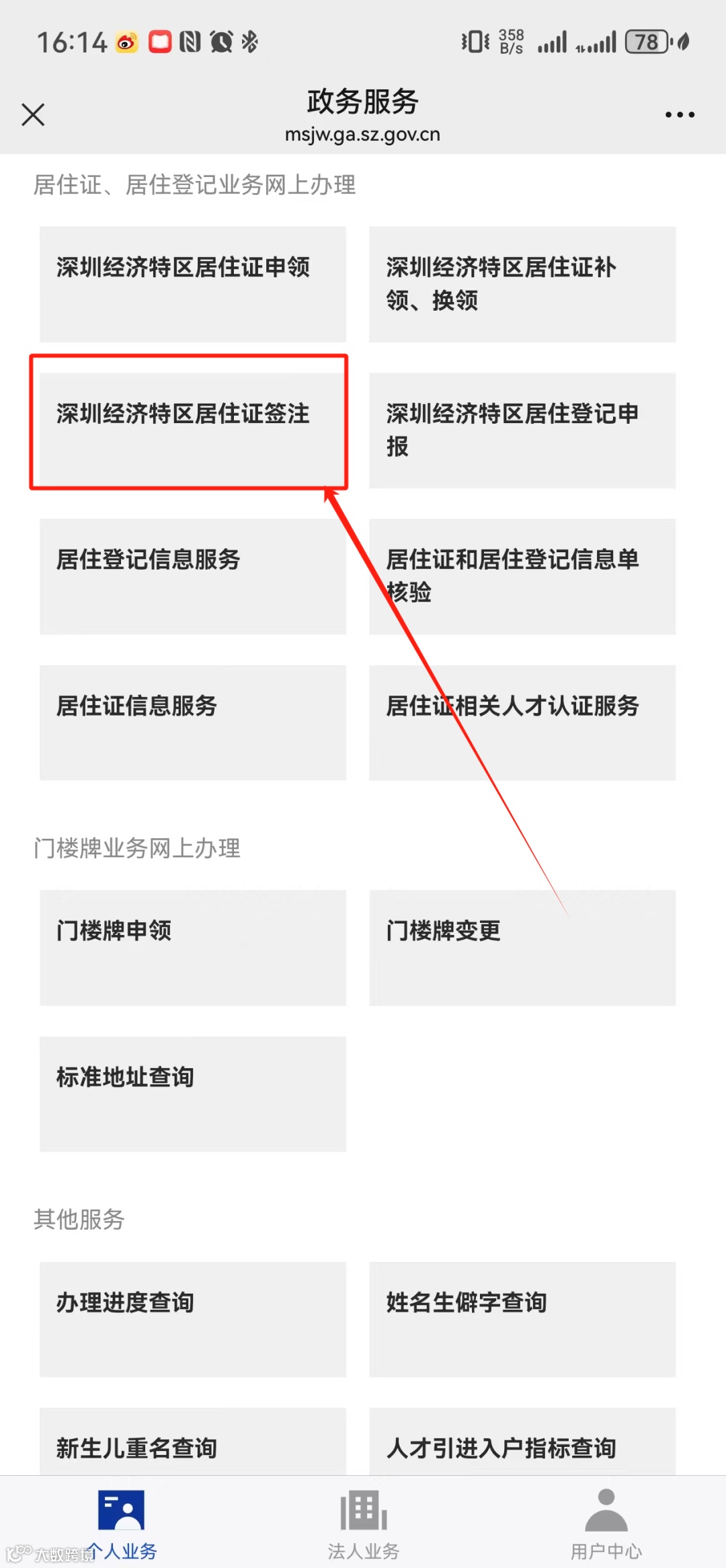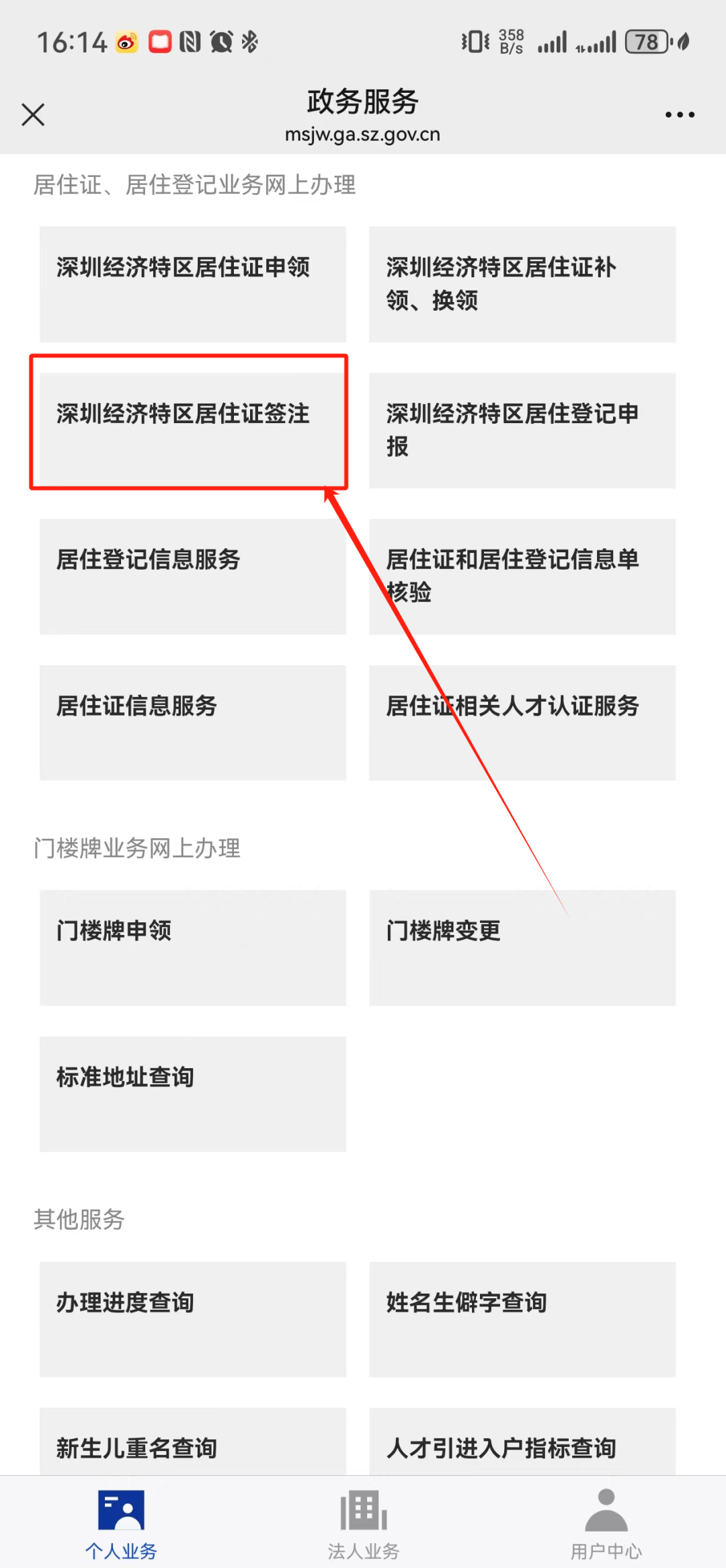 下滑查询【居住证业务】,选择【深圳经济特区居住证签注】