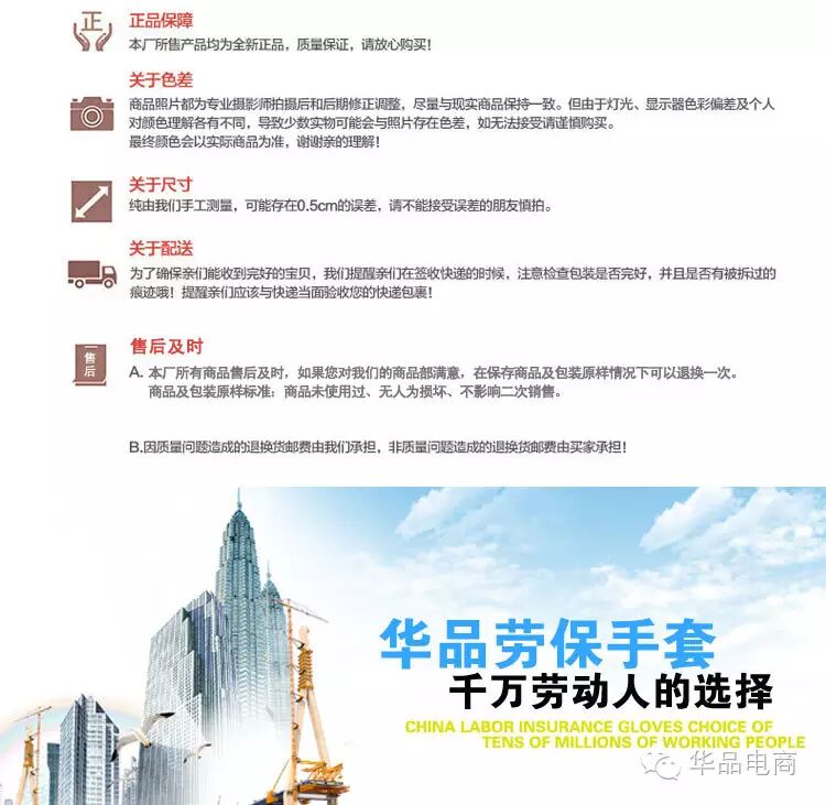 目前主要经营有劳保鞋、劳保手套、电焊防护服(套)等劳保防护用品,利用先进的互联网技术,直接把优质的商品从生产车间直接送到终端使用用户手中,大大降低流通成本,利好于终端消费者。创造一流的交易环境,华品电商,做中华品质,欢迎咨询合作!