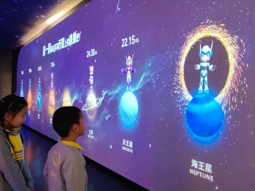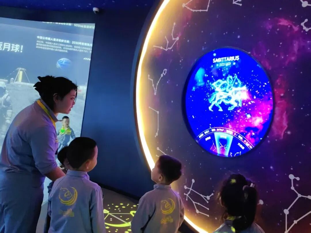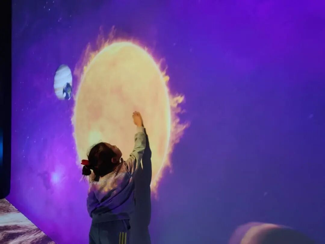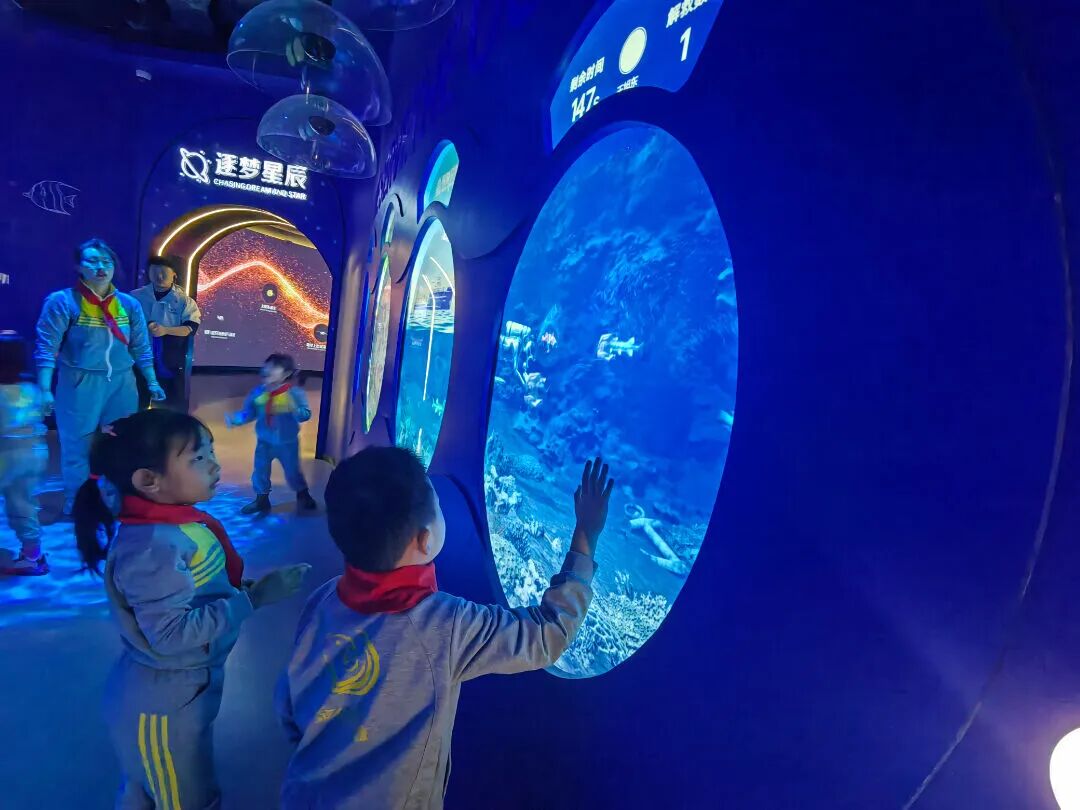 在这里,绝美的星河在眼前缓缓展开,恒星陨石随手可触,幼儿沿着漫长的时间线探索宇宙的奥秘,还可以将自己置身于海洋世界中,与各种海洋生物亲密互动。他们感受登录月球的快乐,探秘行星的奥秘。