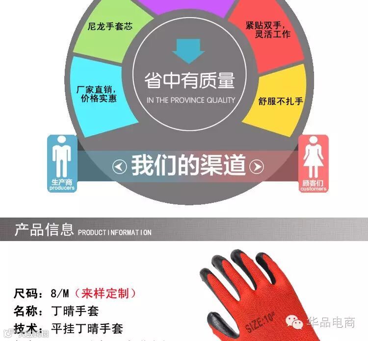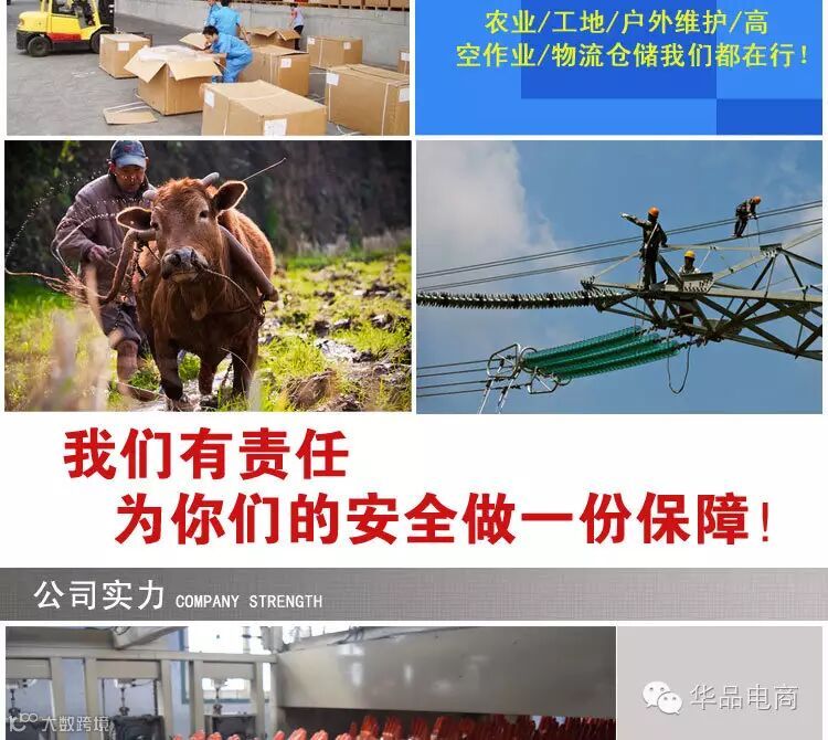目前主要经营有劳保鞋、劳保手套、电焊防护服(套)等劳保防护用品,利用先进的互联网技术,直接把优质的商品从生产车间直接送到终端使用用户手中,大大降低流通成本,利好于终端消费者。创造一流的交易环境,华品电商,做中华品质,欢迎咨询合作!