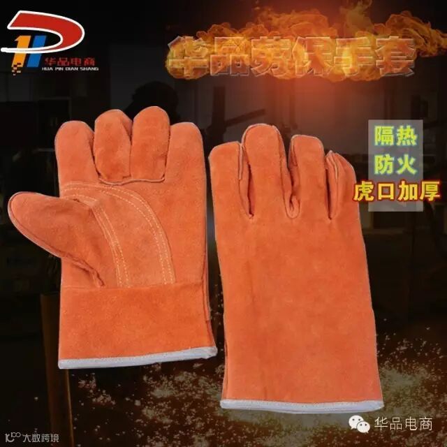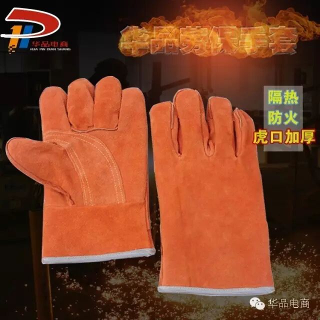 普通的手工焊手套所谓手工焊,就是我们平时常见的一把钳子夹住焊条的这种焊接。这类焊高温飞溅物多。所以用的手套多为加里的双层。长度也在34CM以上。