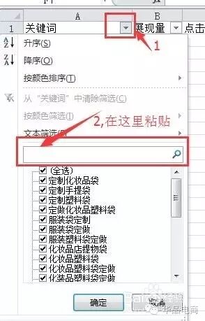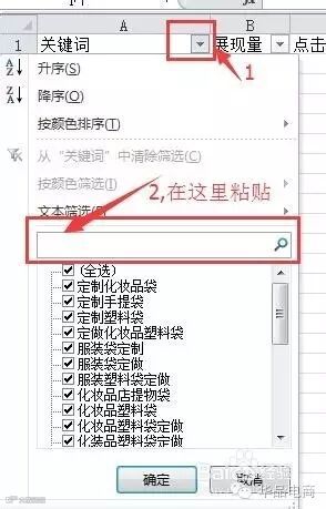 点击左上角“关键词”右边的“倒三角”,如下图红框1,接着在搜索栏里粘贴你刚刚复制的服装两字,如下图红框处2.