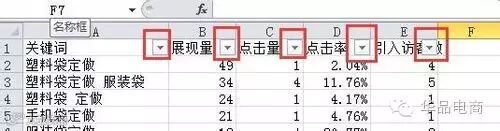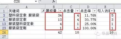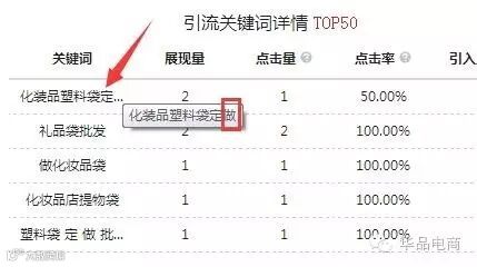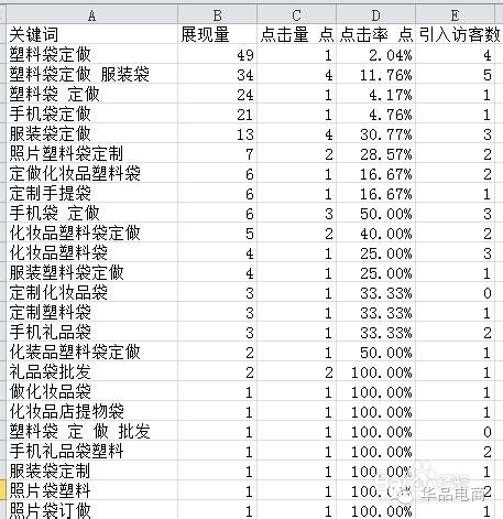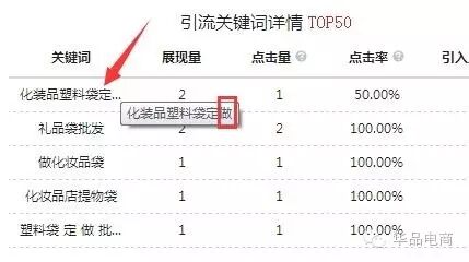 从上面的数据中可以看出,最后的四个关键词PE,童装,可,印刷这几个关键词完全没有为我们带来流量,所以我们是不是应该要去掉这四个占了我们字符的关键词呢?还有,倒数第五个关键词“订做”,一个月30天内只为我们事业来一个流量,我们是不是也要把它去掉了。所以原标题“服装袋定做 订做PE塑料袋手提袋手机袋 定制童装袋礼品袋可印刷”