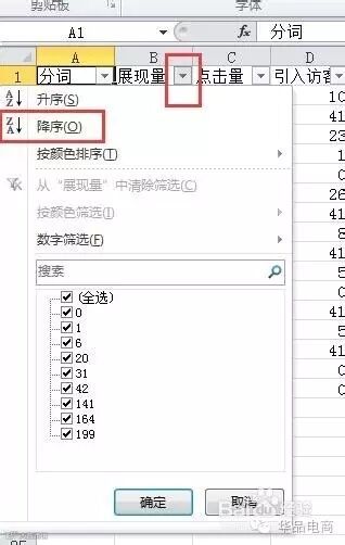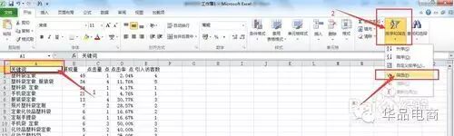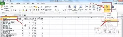 先鼠标左键点击左上角“关键词”三个字,如下图红框1。接着点击EXCEL右边的“排序与筛选”,如下图红框2。最后再点选“筛选”,如下图红框3。