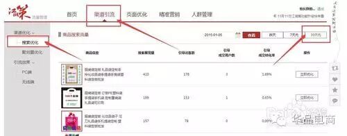 首先我们先打开“江湖策”,然后点击“渠道引流”,左边的“搜索优化”,和最右边的“近30天内”,如下图三处红框