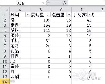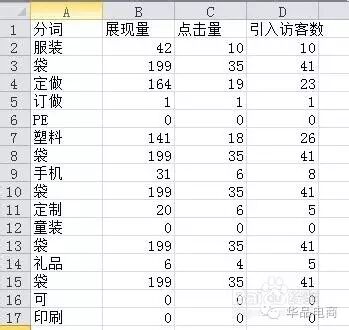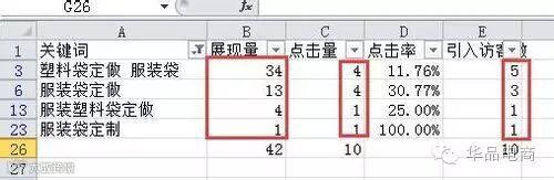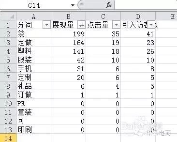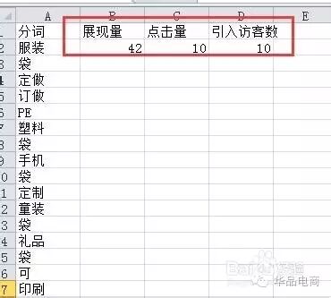 把42,10,10分别复制到分词表里,随便也在分词表里插入新一行,写上展现量,点击量,引入访客数。如下图