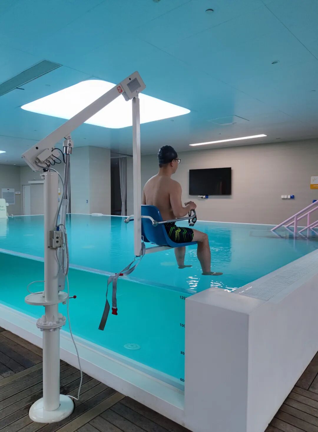 每个池子都配备了无障碍转移装置,即使完全不能行动的患者,也能安全进入水中。24小时循环过滤系统不停运转,每两周进行一次全面清洁,这套系统的运行成本不菲,却是治疗安全的基本保障。