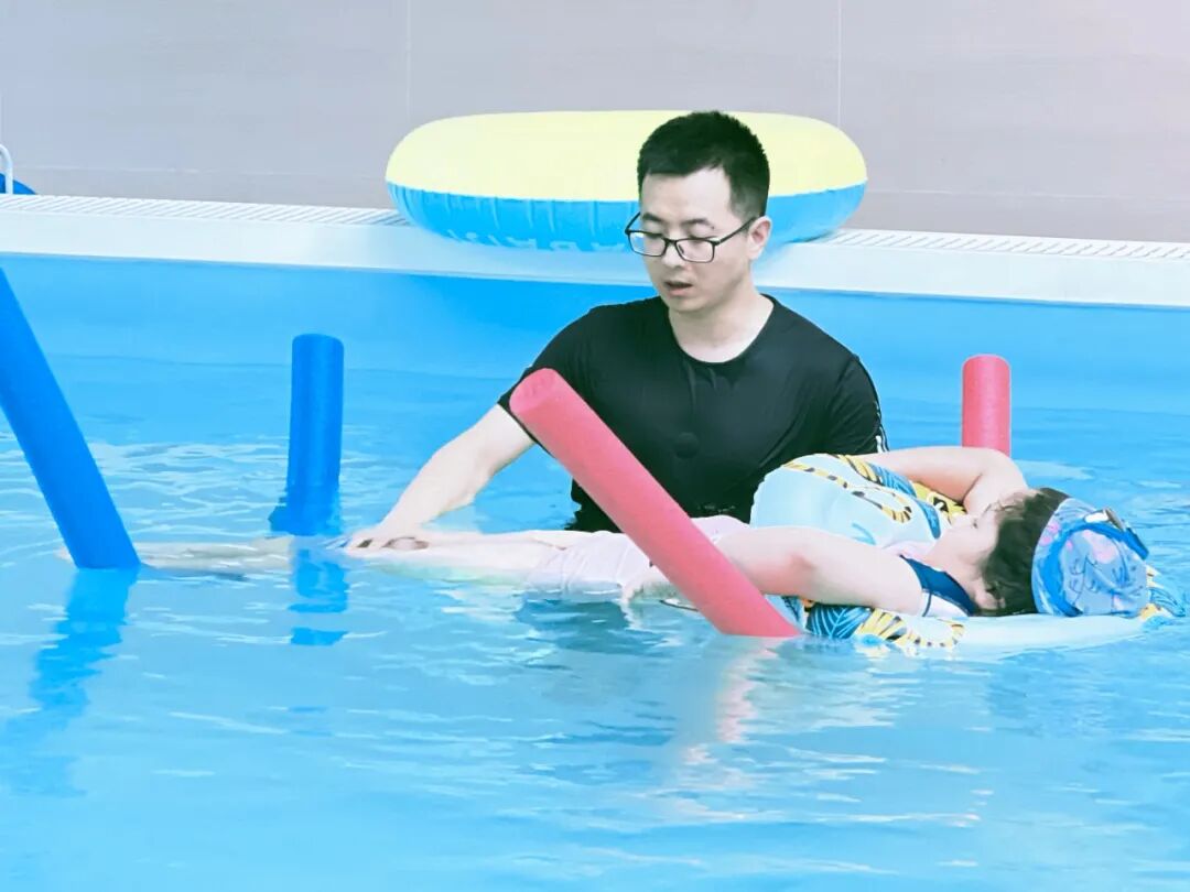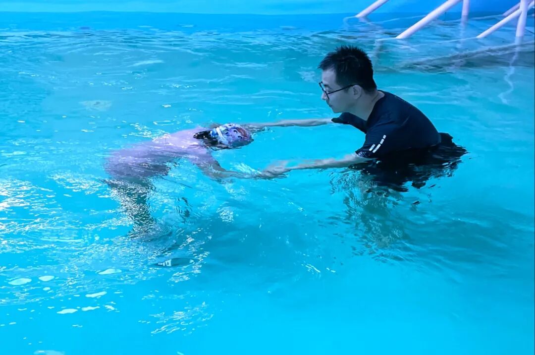 另一个案例是先天失明的孩子。在陆地上,他很多活动无法参与,但在水中,他学会了憋气、漂浮和站立。后来,他能在游泳池里独立游上两圈,和其他的孩子一起玩水中游戏,甚至大胆地在水中进行跳跃动作——这在地面上是他从来不敢尝试的。