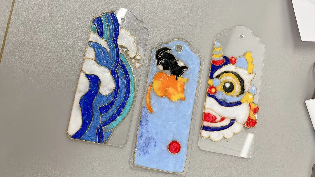 通过“绘图、掐丝、点蓝”等工序,将金丝与釉料化作精美的书签纹样。代表佛山文化的狮子头、寓意乘风破浪的海浪图......经过职工们的双手呈现出来,栩栩如生。