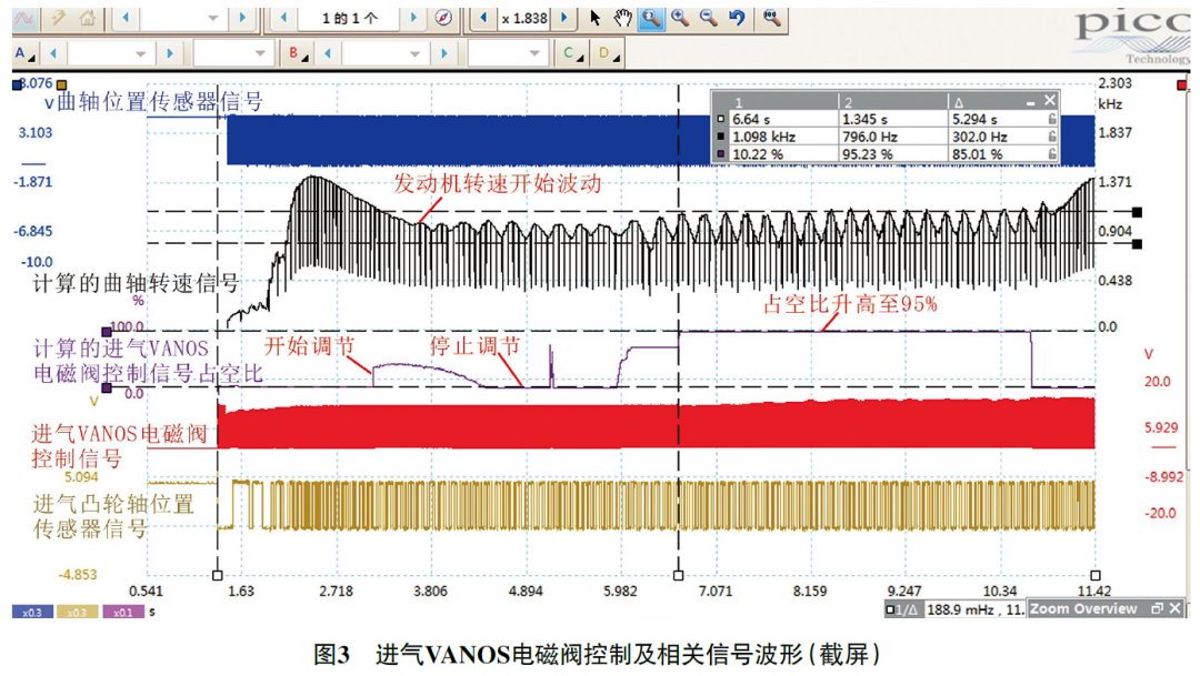 从DME导线连接器处测量进气VANOS电磁阀控制信号波形(图3),发现起动发动机后,DME立即开始控制进气VANOS电磁阀工作,控制信号的占空比在5 s内迅速由10%升高至95%(期间有停止控制),同时发动机转速开始出现明显波动。
