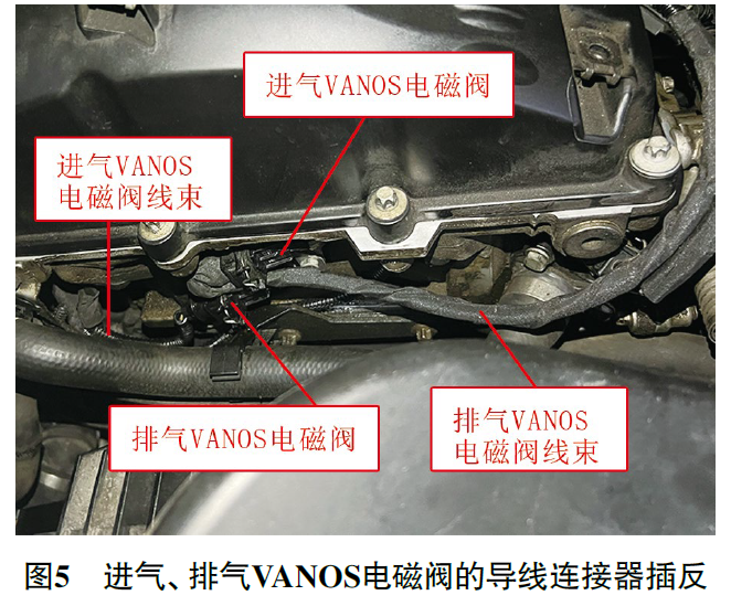 进气VANOS电磁阀已更换,VANOS调节油路及滤网已清洗,DME又能正常发送控制信号,难道真的是进气VANOS调节单元损坏了?DME向进气VANOS电磁阀发送控制信号后实际进气凸轮轴相位并没有调节,为什么发动机转速会发生明显波动呢?此时考虑到该款发动机进气、排气VANOS电磁阀的安装位置靠近,导线连接器比较容易插反,于是参照维修手册检查进气、排气VANOS电磁阀的线束,结果发现进气、排气VANOS电磁阀的导线连接器真的插反了(图5)。