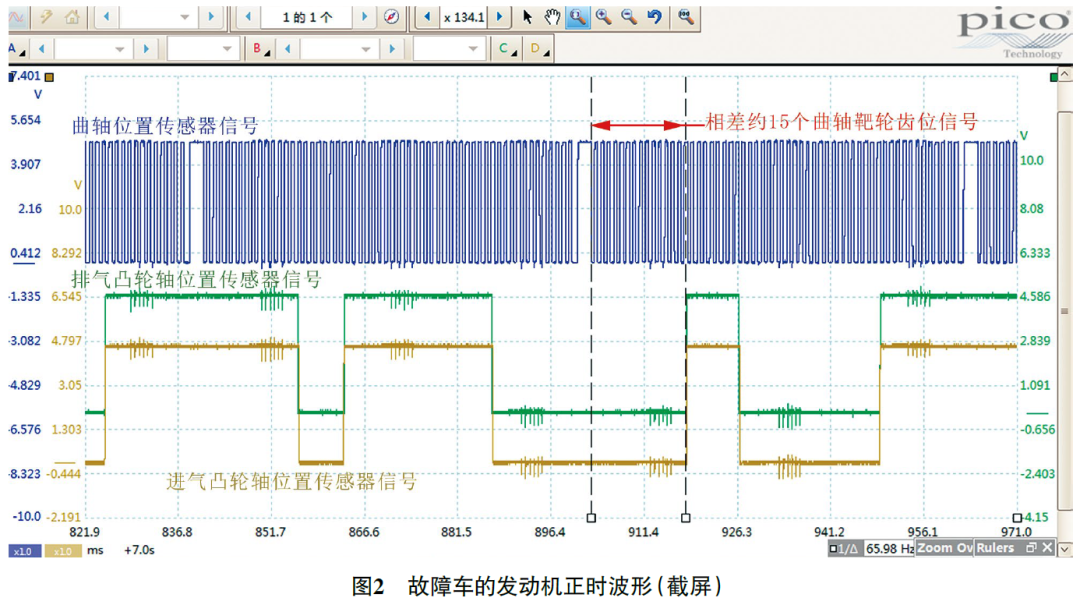 接车后试车,故障现象与维修人员所述一致。首先用虹科Pico汽车示波器从DME导线连接器处测量发动机正时波形(图2),发现进气、排气凸轮轴位置传感器信号基本重合;曲轴位置传感器的齿缺信号与进气、排气凸轮轴位置传感器的窄齿信号上升沿相差约15个曲轴靶轮齿位信号。与正常同款发动机的正时波形进行对比,确认该车发动机正时正常。