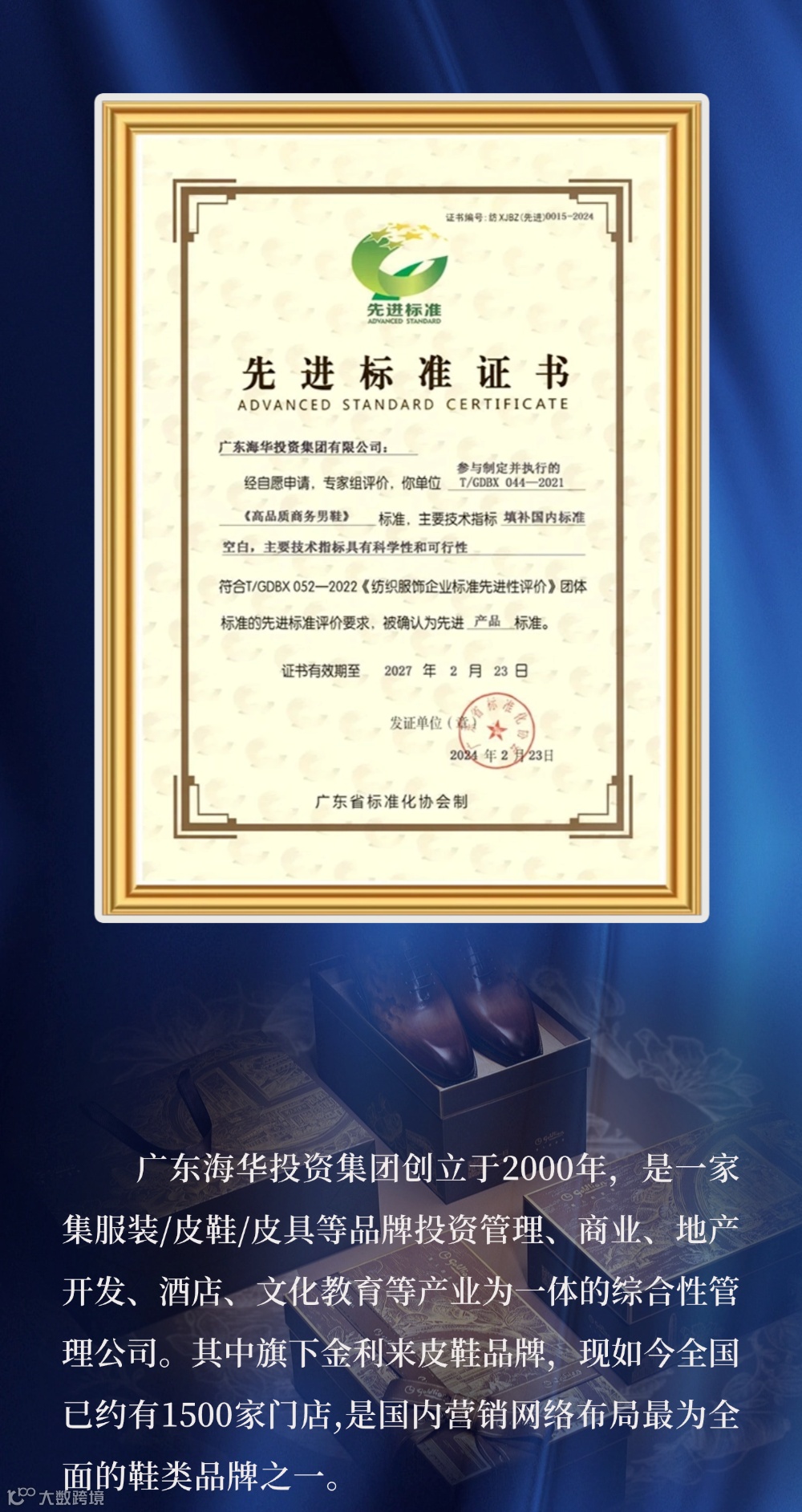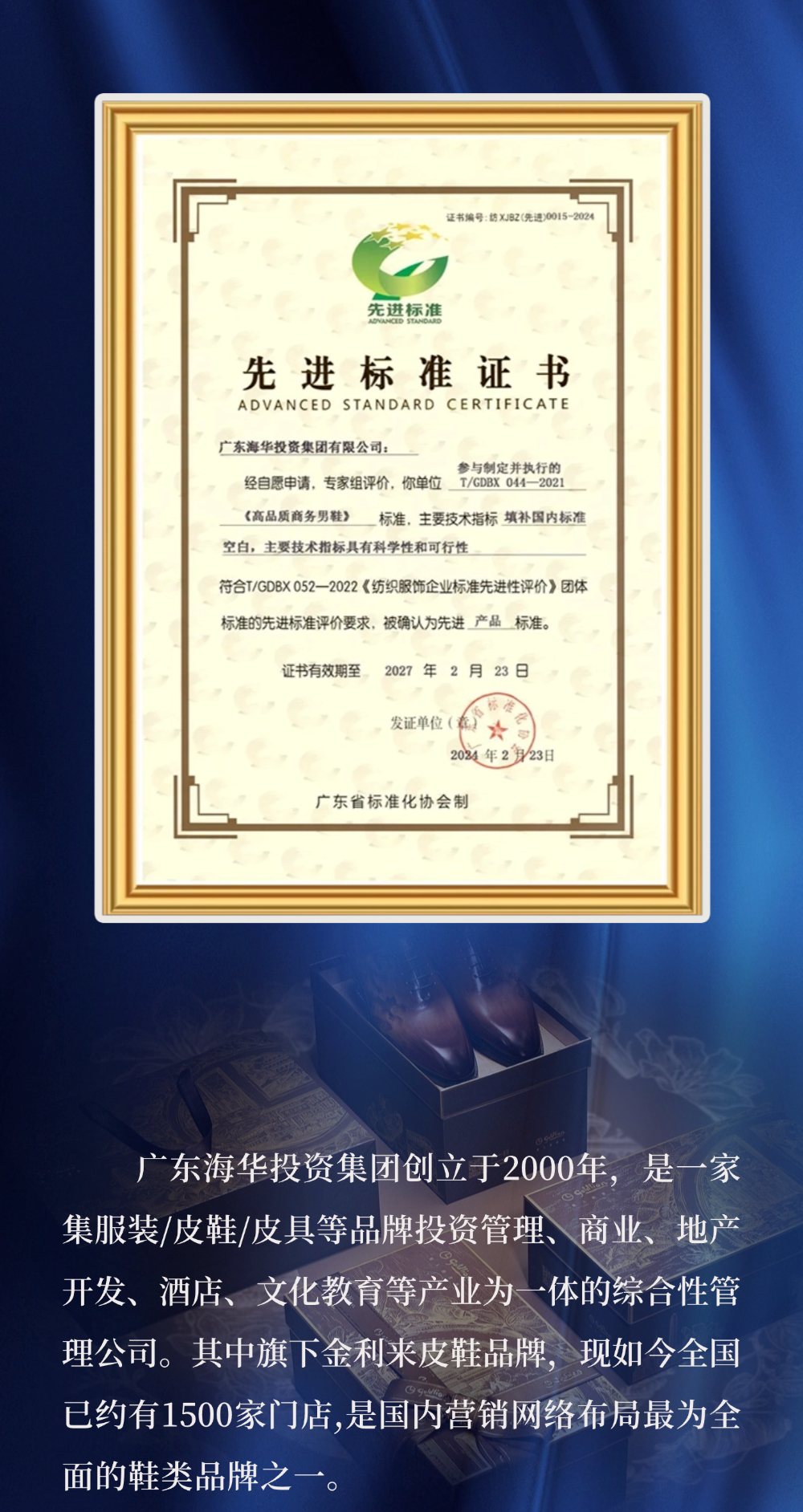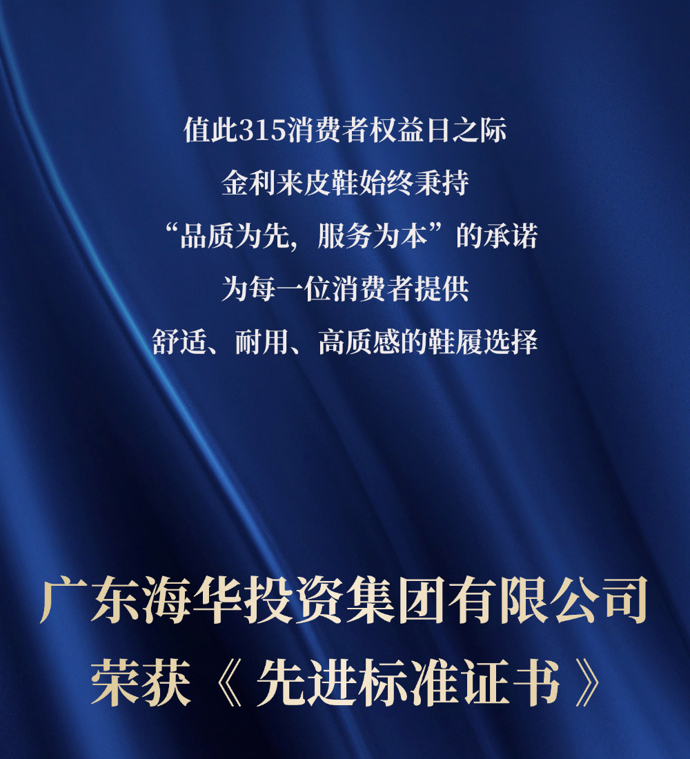 广东海华投资集团有限公司成立于2000年,是以贸易发展为主,集轻工产品开发、生产、销售为一体的股份制企业,是金利来公司在中国市场的重要战略合作伙伴,取得“金利来”皮鞋系列产品唯一在中国大陆地区之开发、生产、销售等经营管理权。