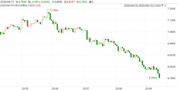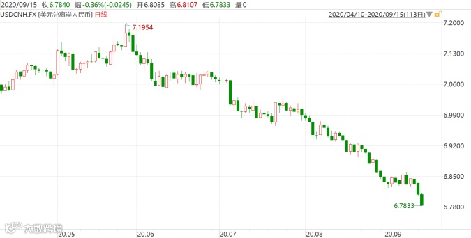 9月15日上午,在岸、离岸人民币对美元汇率双双升破6.8元,再创本轮升值新高,回到去年5月上旬水平。