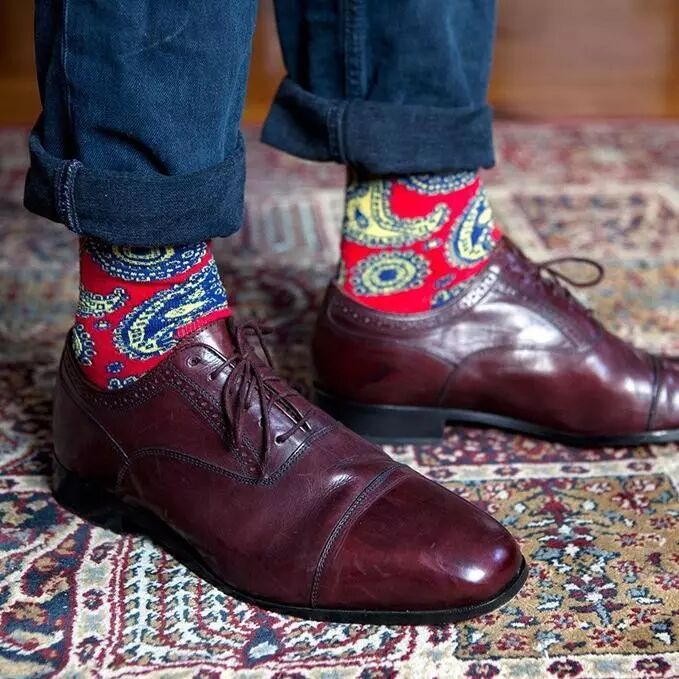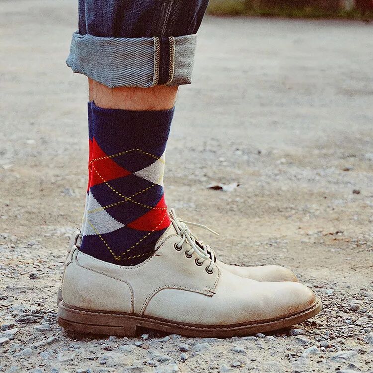 TIPS:当你出行休闲场所,请选择一双引人注目的醒目袜子,搭配布洛克鞋子、德比鞋或乐福鞋,大大增加您的吸引力。
