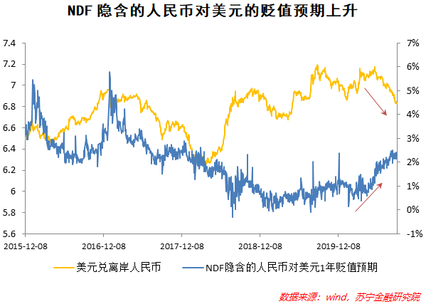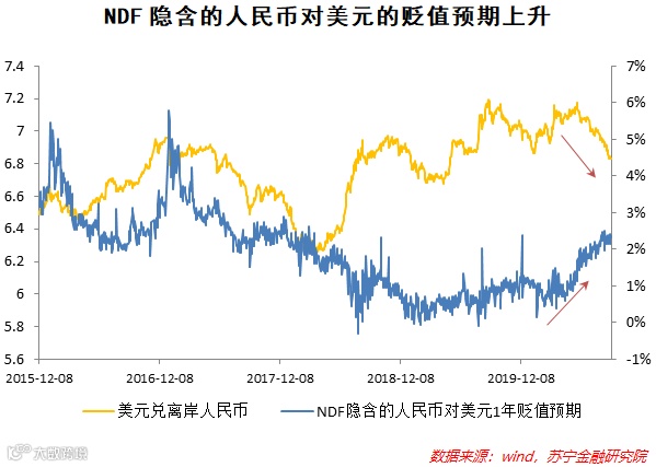 从以上4个因素看,短期人民币汇率升值因素和不确定性并存。但市场对未来人民币贬值的预期在近期逐渐加强,在人民币即期汇率持续飙升的情况下,NDF(Non-deliverable Forwards,人民币无本金交割远期)隐含的人民币对美元的贬值预期(衡量美元兑人民币1年期远期汇率与即期汇率的差别)却在持续提高,市场普遍对中美之间的贸易形势存在较大担忧。