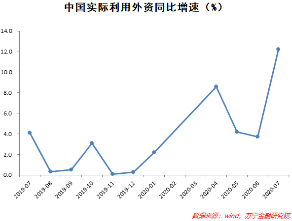 利率导致资本流入,中国经济的高增长也同样吸引外资持续流入。IMF预测2020年全球GDP将萎缩4.9%。这是自大萧条以来,IMF最悲观的预测。同时,IMF强调,在主要经济体中,印度和欧元区是下调幅度最大的地区,美国经济也将萎缩8%。而中国是今年唯一实现经济增长的主要经济体。从外商直接投资来看,中国2020年以来的实际使用外资增速显著高于去年同期。