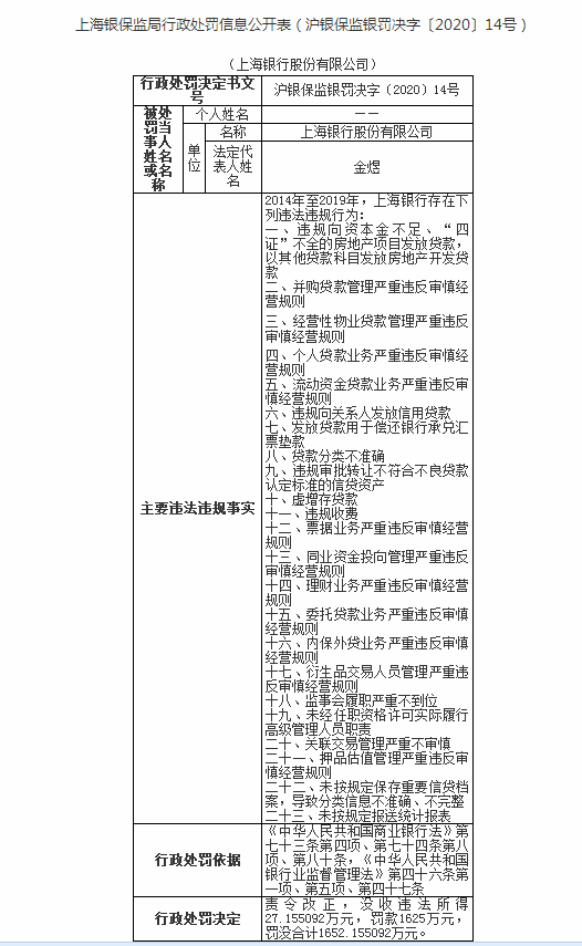 处罚信息公开表显示,上海银行股份有限公司在2014年至2019年年间,存在下列违法违规行为:违规收费;违规向资本金不足、“四证”不全的房地产项目发放贷款,以其他贷款科目发放房地产开发贷款;违规向关系人发放信用贷款;发放贷款用于偿还银行承兑汇票垫款;违规审批转让不符合不良贷款认定标准的信贷资产等。