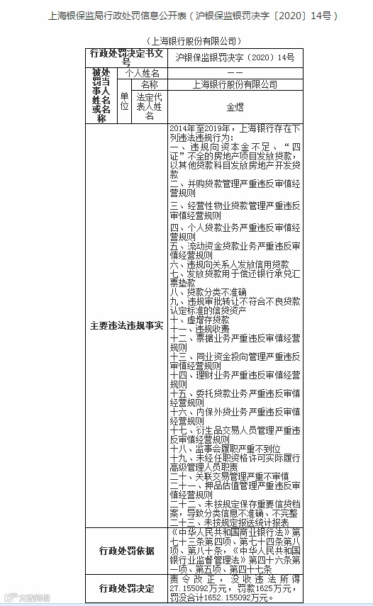 8月14日,上海银保监局处罚信息显示,上海银行在2014~2019年因为23项业务违规,被处罚款1625万元,其中没收违法所得27.15万元。